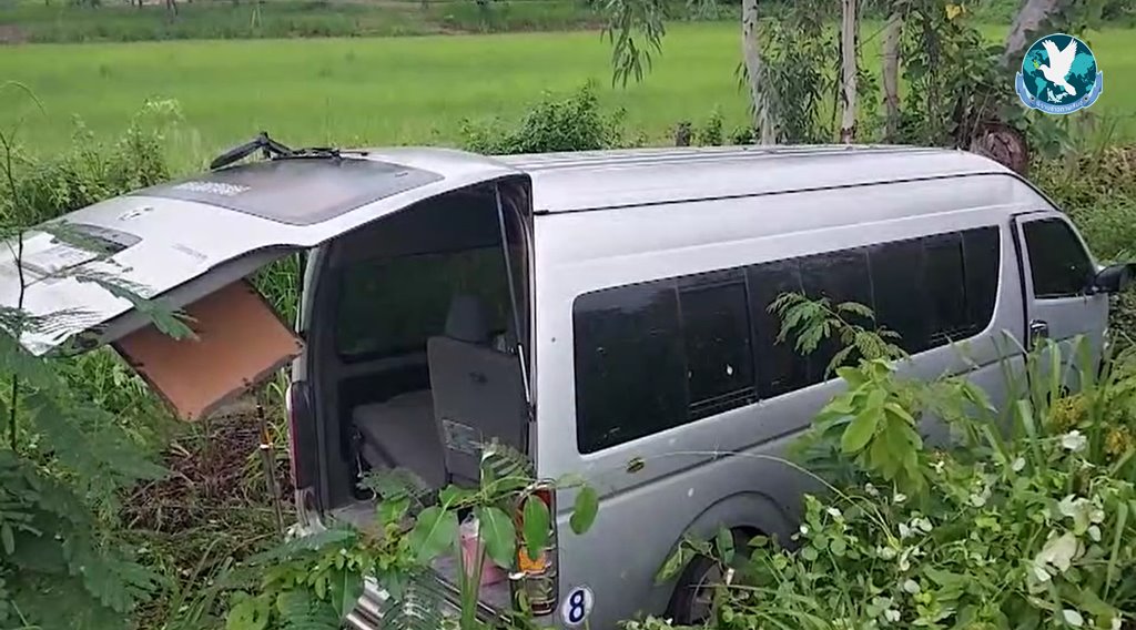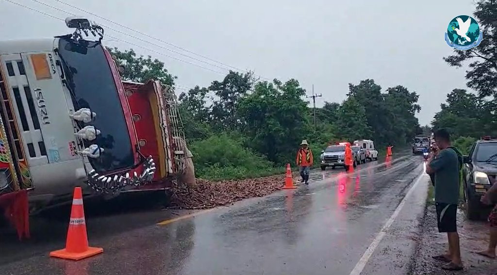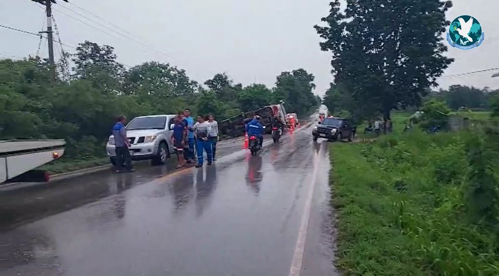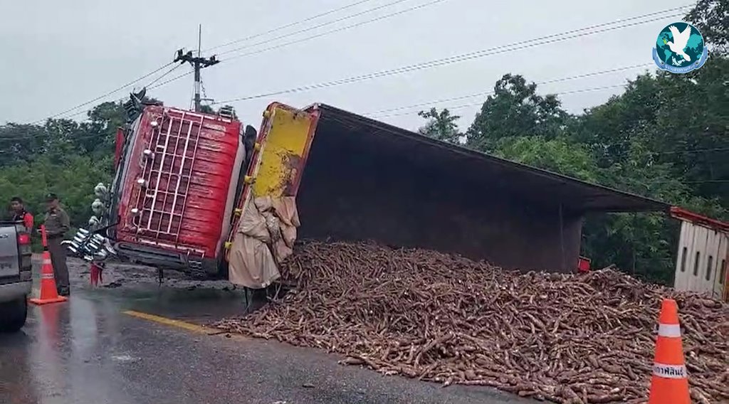 หน้าฝนตกถนนลื่นอย่าประมาท แล้วก็เกิดเหตุการณ์การณ์สุดระทึก เมื่อรถบรรทุกพ่วงขนมันสำปะหลังเต็มคัน ขับลงเนินฝ่าสายฝนพรำ เหยียบเบรกกระชันชิด ทำให้รถเกิดเสียหลัก รถขวางลำกลางถนน จังหวะเดียวกันรถตู้รับส่งนักเรียนขับสวนทางกันมาพอดี คนขับหักหลบรถเสียหลักตกข้างทางชนเข้ากับต้นไม้อย่างจัง นักเรียนอนุบาล-มัธยมต้น โรงเรียนเอกชนชื่อดัง 19 ชีวิต หวิดดับหมู่ นร.บาดเจ็บ 14 ราย