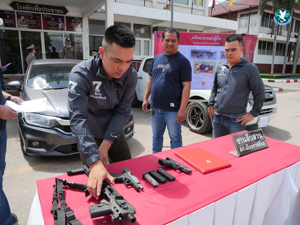 พ.ต.อ.วีระ หางนาค รรท.ผกก.สภ.เมืองกาฬสินธุ์ กล่าวว่า วันนี้สถานีตำรวจภูธรเมืองกาฬสินธุ์ ได้จัดแถลงข่าวประชาสัมพันธ์การจับกุมคดีรายสำคัญ กรณีมีกลุ่มคนร้ายใช้อาวุธปืนยิงใส่บ้านชาวบ้านทำให้มีผู้ได้รับบาดเจ็บ โดยเหตุเกิดวันที่ 16 ตุลาคม 2567 เวลาประมาณ 04.30 น. ที่บ้านเลขที่ 45 หมู่ 4 ต.หนองกุง อ.เมืองกาฬสินธุ์ หลังจากทราบเหตุผู้บังคับบัญชาได้สั่งการให้เร่งรัดจับกุมติดตามคนร้าย โดย สภ.เมืองกาฬสินธุ์ได้บูรณาการทุกสายงานทั้งฝ่ายสืบสวน ฝ่ายปราบปราบ ฝ่ายสอบสวน และกองกำกับการสืบตำรวจภูธรจังหวัดกาฬสินธุ์ จากการสืบสวนได้รวบรวมพยานหลักฐานจนศาลออกหมายจับ มีผู้ก่อเหตุ เบื้องต้นมีศาลออกหมายจับจำนวน 4 ราย มี นายหนึ่ง, นายแป็ก, นายธง และนายสโต มีรถที่กลุ่มคนร้ายขับมาก่อเหตุ จำนวน 3 คัน ซึ่งเราได้ตรวจยึดมา พร้อมได้ตรวจยึดอาวุธปืนก่อเหตุจำนวน 2 กระบอก โดยกลุ่มผู้ต้องหาได้ยอมรับสารภาพ เนื่องจากก่อนเกิดเหตุมีการทะเลาะวิวาทในตัวเมืองมาก่อน แล้วติดตามไปเอาคืนกัน ไปเพื่อเจรจาหรือว่าตกลงกันแต่ก็มีการใช้อาวุธปืนยิงใส่ไปในบ้าน ซึ่งในส่วนของ สภ.เมืองฯ ก็จะได้มีการตรวจค้นอาวุธปืนอย่างต่อเนื่อง เนื่องจากอาวุธปืนเป็นอาวุธสำคัญในการใช้ก่อเหตุ ซึ่งที่ผ่านมาก็มีการจับกุมอยู่เรื่อย โดยกลุ่มที่ก่อเหตุก็รู้จักกันมาก่อน มีคดีเก่าติดตัวอยู่ทั้งสองกลุ่ม บางคดีศาลตัดสินแล้วและบางคดีก็อยู่ระหว่างดำเนินการ ในส่วนคนร้ายที่เหลือถ้ามีพยานหลักฐานเพิ่มเติมเราก็จะพิจารณาขออนุมัติต่อศาลออกหมายจับเพิ่มเติม