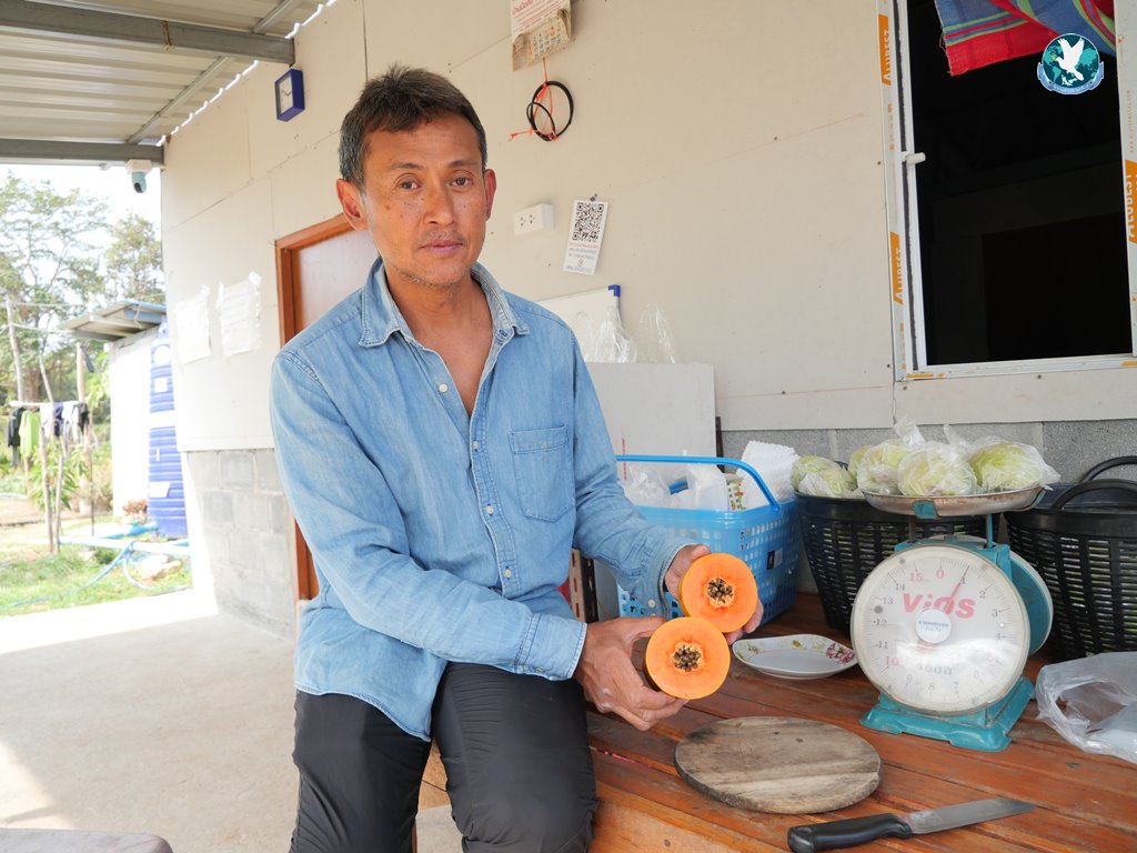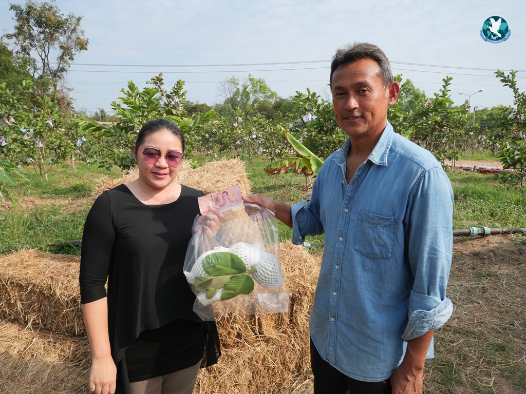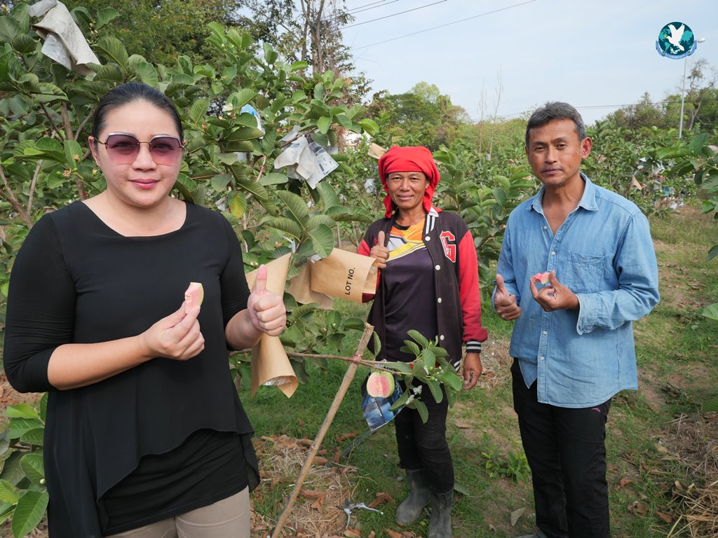 นายธีรวุฒิ ชัยพัฒน์ หรือที่เพื่อนๆ นิยมเรียก “สจ๊วตเอ๋” วัย 55 ปี อดีตพนักงานสายการบินไทย ที่ผันตัวเองมาลุยเป็นเกษตรกรเต็มตัว เปิดเผยกับผู้สื่อข่าวว่า เรียนจบมาเมื่อปี 2532 ก็เข้าทำงานที่การบินไทยเลย ทำงานมากว่า 30 ปี พอมามีสถานการณ์การแพร่ระบาดของโควิด-19 เลยลาออกมาทำการเกษตร เริ่มจากการรับซื้อเม็ดมะรุมมาทำน้ำมะรุมจำหน่าย ส่วนฝรั่งไต้หวันก็เห็นว่าเป็นพันธุ์ไม้ที่อร่อยแล้วให้มูลค่าค่อนข้างสูง และส่วนมากคนก็ไม่ค่อยปลูกแบบอินทรีย์ ประกอบกับแถวนี้มีมูลวัวเยอะ แล้วก็ได้ความรู้จากการไปเข้าโครงการอบรมของ โคก หนอง นา ก็เจอวิทยากรที่ให้ความรู้เกี่ยวกับพวกจุลินทรีย์ต่าง ๆ น้ำหมักต่าง ๆ ก็เลยตัดสินใจไปซื้อต้นฝรั่งจากอัมพวามา จำนวน 500-600 ต้น ราคาต้นละ 120 บาท ได้ต้นพันธุ์ความสูงประมาณ 70-80 ซม. ซึ่งเจ้าของสวนที่ตนซื้อมาได้บอกว่าเมื่อก่อนราคาต้นพันธุ์ต้นละ 500-600 บาทเลยทีเดียว ซึ่งตอนแรกตนเองก็ไม่ได้ปลูกแบบอินทรีย์ ก็เคยใช้สารเคมีมาก่อน แต่พอใช้ไปค่าใช้จ่ายต่าง ค่ายาฆ่าแมลงก็ค่อนข้างสูง แล้วพันธุ์ไม้ก็ตายด้วย เพราะมีโรคต่าง ๆ เข้ามาแรงขึ้นเรื่อย ๆ ต้องเปลี่ยนยาไปเรื่อย ๆ ทำให้สูญเงินไปจำนวนหนึ่ง ก็เลยกลับมาเน้นพวกเกษตรอินทรีย์ 100% ทำน้ำหมักชีวภาพเอง ทำจุลินทรีย์สีแดงสังเคราะห์แสงเอง น้ำหมักจาวปลวก และน้ำหมักปลา ก็โชคดีมีเพื่อนทำงานอยู่โรงงานน้ำปลาร้าแม่บุญล้ำ ก็สามารถสั่งปลาทะเลทีละ 30-40 กก.มาทำน้ำหมักได้ และไปหาซื้อวัตถุดิบตามร้านขายผลไม้ข้างทางพวกสับปะรดภูแลมาหมักเพิ่มความหวาน ทีนี้ผลผลิตที่ได้มามันก็ดีเกินคาด สีสวย รสชาตหวานกรอบ ต้นไม้ก็มีความแข็งแรง อีกทั้งเรายังลงทุนเผาถ่านเองเพื่อเอาน้ำส้มควันไม้ มาใช้ฉีดพ่นป้องกันแมลง ทำให้ไร่ฝรั่งของเราเป็นธรรมชาติมาก”