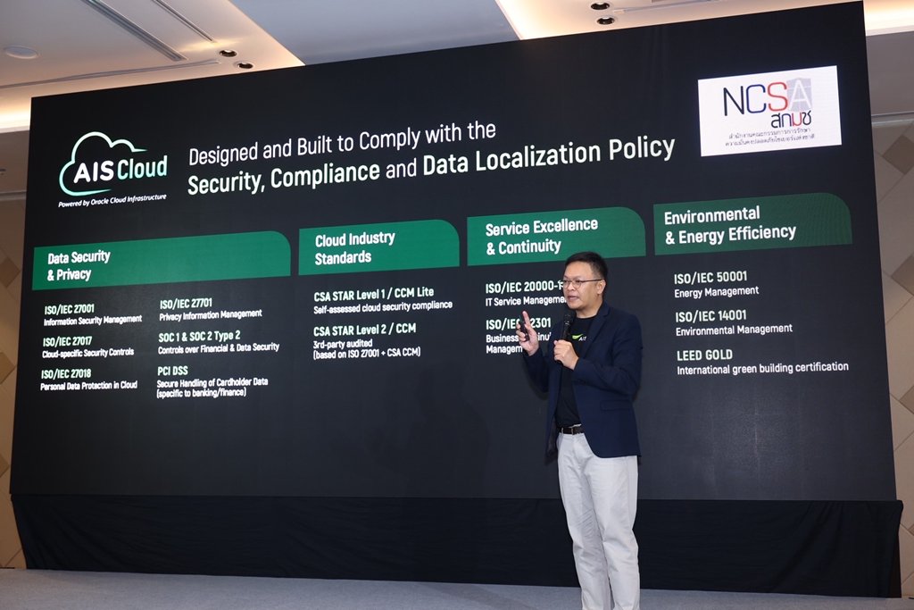 AIS Business ในฐานะผู้นำบริการด้านเทคโนโลยีอัจฉริยะเพื่อองค์กรธุรกิจ เดินหน้ายกระดับโครงสร้างพื้นฐานดิจิทัลของประเทศ ประกาศความพร้อมเป็นแพลตฟอร์มเพื่อการพัฒนา AI และโครงสร้างพื้นฐานดิจิทัลของประเทศ เปิดตัวบริการ “AIS Cloud powered by Oracle Cloud Infrastructure” ครั้งแรกในประเทศไทยกับโครงสร้างพื้นฐานคลาวด์มาตรฐานระดับโลก หรือ Hyperscale Cloud ซึ่งถือเป็นรายเดียวที่มีศูนย์ข้อมูลอยู่ภายในประเทศ ให้บริการโดยบริษัทไทย 100% อยู่ภายใต้การกำกับดูแลตามกฎหมายไทย พร้อมรองรับการขยายตัวของเทคโนโลยี AI, Machine Learning, Big Data อย่างครบวงจร ตอบโจทย์ความปลอดภัยด้านข้อมูลตามมาตรฐานรักษาความมั่นคงปลอดภัยไซเบอร์ เพื่อขับเคลื่อนองค์กรทั้งภาครัฐและเอกชนไทยสู่การเปลี่ยนผ่านในยุคดิจิทัลด้วย AI ได้อย่างแท้จริง