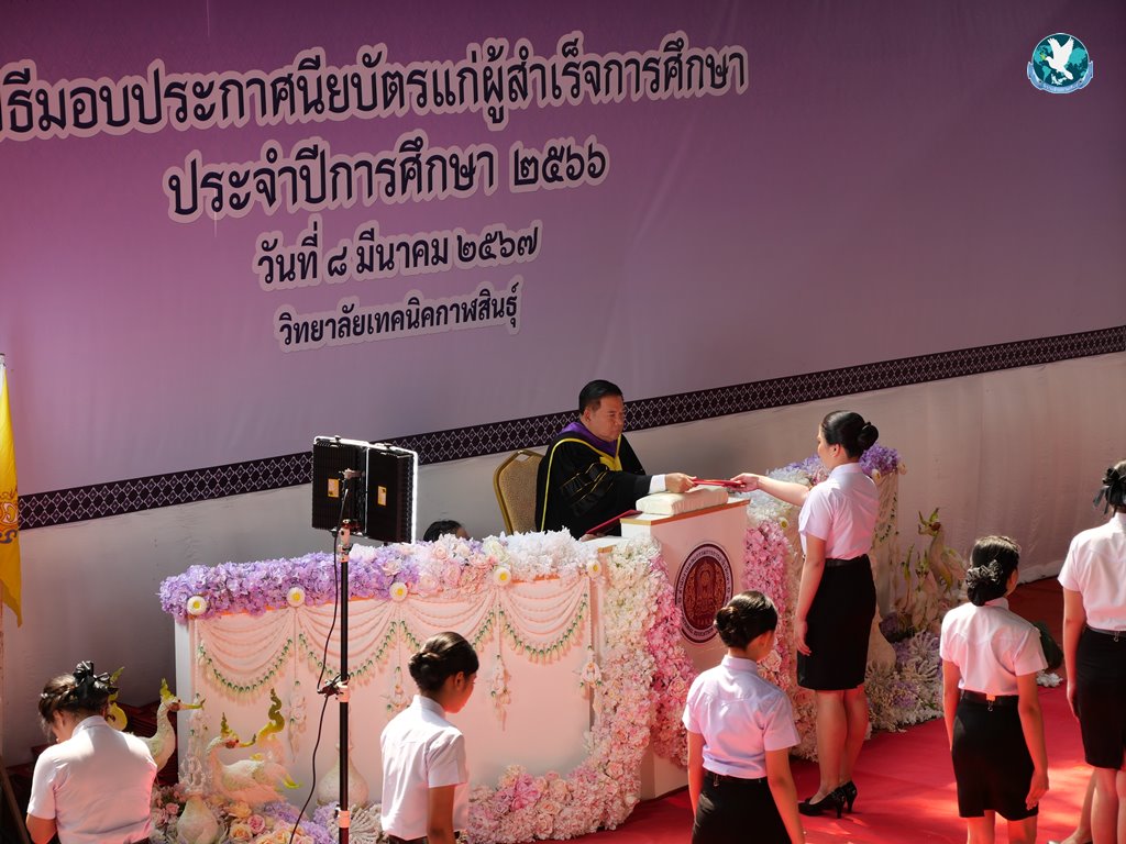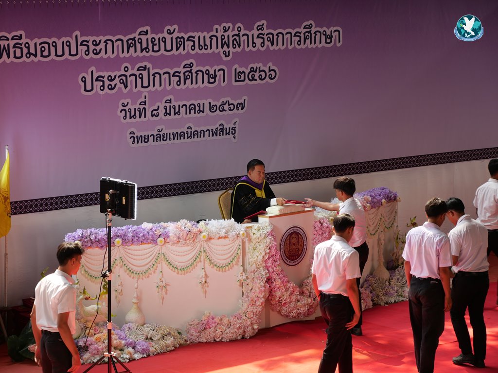 นายประดิษฐ์ ญาณประเสริฐ ผู้อำนวยการวิทยาลัยเทคนิคกาฬสินธุ์ กล่าวว่า พิธีมอบประกาศนียบัตร เป็นพิธีที่มีความสำคัญ ต่อผู้สำเร็จการศึกษา ซึ่งทางวิทยาลัยเทคนิคกาฬสินธุ์ ได้ดำเนินการจัดพิธีมอบประกาศนียบัตรแก่ผู้สำเร็จการศึกษา มาอย่างต่อเนื่อง โดยมีวัตถุประสงค์ เพื่อให้นักเรียน นักศึกษา เกิดความภาคภูมิใจในความสำเร็จของตนเอง เกิดความรัก ความศรัทธา ในสถาบันการศึกษา ปลูกสำนึกในด้านความกตัญญูกตเวที เสริมสร้างความรักความสามัคคีในหมู่คณะ และเพื่อให้ผู้ปกครองได้เกิดความภาคภูมิใจในความสำเร็จของบุตรหลาน โดยในปีการศึกษา 2566 นี้ มีนักเรียน-นักศึกษา สำเร็จการศึกษา จำนวน 1,052 คน โดยแบ่งเป็น ระดับประกาศนียบัตรวิชาชีพ (ปวช.) จำนวน 478 คน และ ระดับประกาศนียบัตรวิชาชีพชั้นสูง (ปวส.) จำนวน 574 คน ถือเป็นสถานศึกษาสังกัดสำนักงานคณะกรรมการการอาชีวศึกษา กระทรวงศึกษาธิการ ที่มีจำนวนผู้สำเร็จการศึกษามากถึง 1,052 คน มากที่สุดในจังหวัดกาฬสินธุ์