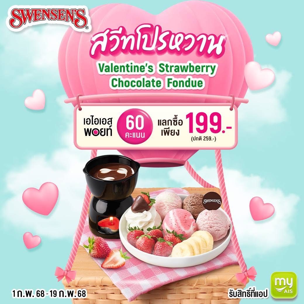 • เสิร์ฟความหวานต่อเนื่องแบบฟินๆ ใช้ AIS Points 60 คะแนน แลกซื้อเมนูพิเศษ วาเลนไทน์ สตรอว์เบอร์รี ช็อกโกแลต ฟองดู เพียง 199.- (ปกติ 259.-) ที่ Swensen’s ทุกสาขา ตั้งแต่วันนี้ – 19 ก.พ. 68