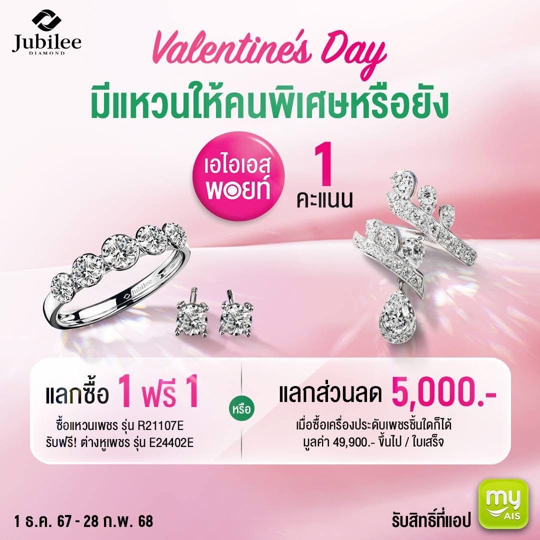 • ของขวัญสุดพิเศษสำหรับคนรู้ใจ เลือกช้อปได้แบบคุ้มสุดๆ ด้วย AIS Points 1 คะแนน แลกซื้อ 1 ฟรี 1 (ซื้อแหวนเพชรรุ่น R21107E ราคาเพียง 29,900 บาท จากปกติ 50,000 บาท พร้อมรับฟรี! ต่างหูเพชร รุ่น E24402E มูลค่า 32,000 บาท) หรือ แลกรับส่วนลด 5,000 บาท เมื่อซื้อเครื่องประดับเพชรชิ้นใดก็ได้ มูลค่า 49,900 บาท ขึ้นไป ที่ Jubilee Diamond (ยูบิลลี่ ไดมอนด์) ตั้งแต่วันนี้ – 28 ก.พ. 68