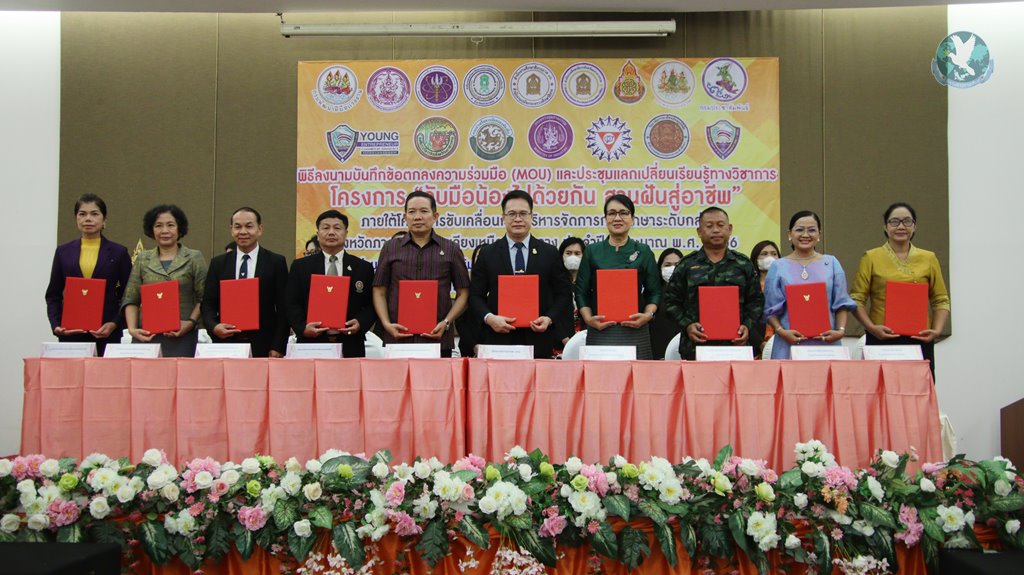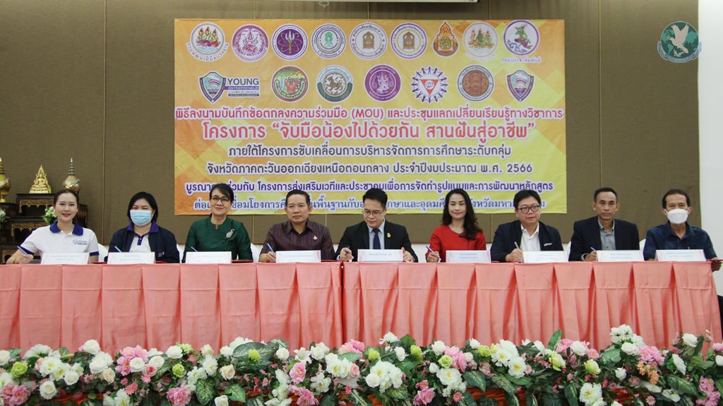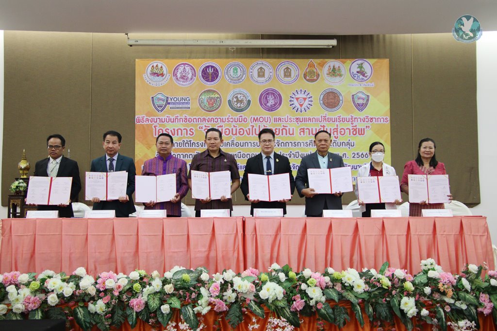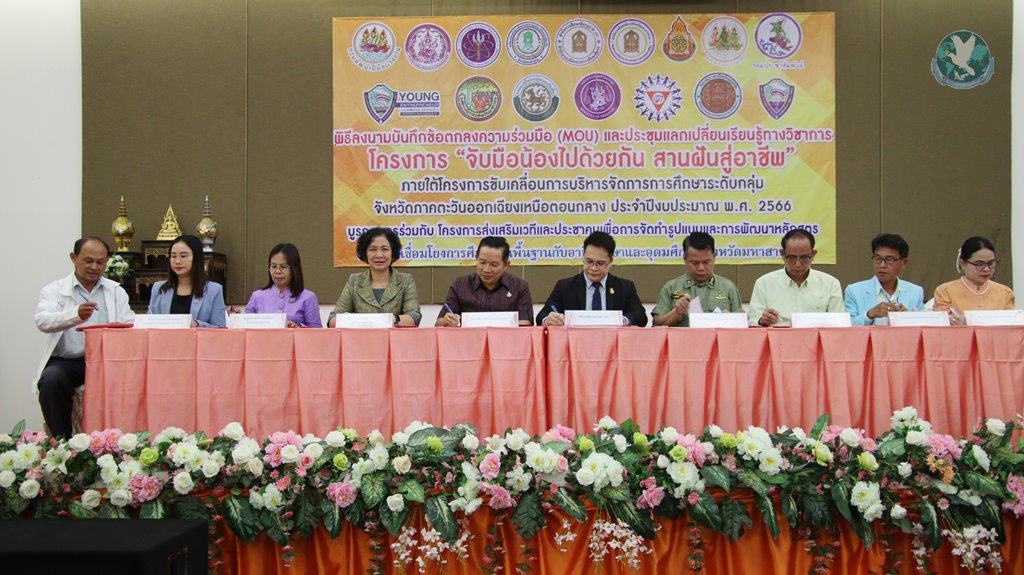 21 มิ.ย.66 ที่ ห้องประชุมลีลาวดี โรงแรมวสุ อ.เมือง จ.มหาสารคาม ดร.สุภชัย จันปุ่ม รองศึกษาธิการภาค 7 ปฏิบัติหน้าที่ศึกษาธิการภาค 12 เป็นประธานในพิธีลงนามบันทึกข้อตกลงความร่วมมือ (MOU) โครงการ “จับมือน้องไปด้วยกัน สานฝันสู่อาชีพ และโครงการส่งเสริมเวทีและประชาคม เพื่อการจัดทำรูปแบบและการพัฒนาหลักสูตรต่อเนื่องเชื่อมโยงการศึกษาขึ้นพื้นฐานกับอาชีวศึกษาและอุดมศึกษา โดยมีนายสุวัฒนพงษ์ ร่มศรี รองศึกษาธิการจังหวัดมหาสารคาม หน่วยงาน สถานศึกษา สถานประกอบการ ภาคีเครือข่าย คณะทำงานดำเนินงานโครงการ พร้อมนักเรียน นักศึกษา เข้าร่วมภายในงาน