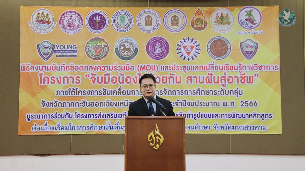 นายสุวัฒนพงษ์ ร่มศรี รองศึกษาธิการจังหวัดมหาสารคาม กล่าวว่า ตามที่สำนักงานปลัดกระทรวงศึกษาธิการ ได้มอบหมายให้สำนักงานศึกษาธิการภาค 12 ดำเนินงานตามโครงการ “จับมือน้องไปด้วยกัน สานฝันสู่อาชีพ” ภายใต้โครงการขับเคลื่อนการบริหารจัดการการศึกษาระดับกลุ่มจังหวัดภาคตะวันออกเฉียงเหนือตอนกลาง ประจำปีงบประมาณ พ.ศ.2566 โดยบูรณาการร่วมกับโครงการส่งเสริมเวทีและประชาคมเพื่อการจัดทำรูปแบบและการพัฒนาหลักสูตรต่อเนื่อง เชื่อมโยงการศึกษาขั้นพื้นฐานกับอาชีวศึกษาและอุดมศึกษา จังหวัดมหาสารคาม ซึ่งเป็นการดำเนินงานการบูรณาการร่วมกับหน่วยงานที่เกี่ยวข้อง หน่วยงานทางการศึกษา สถานประกอบการและภาคีเครือข่าย ให้เข้ามามีส่วนร่วม ส่งเสริม สนับสนุน และพัฒนาทักษะผู้เรียนกลุ่มเยาวชนว่างงานและไม่อยู่ในระบบการศึกษา ให้ได้รับการศึกษาที่เหมาะสม มีความสามารถในการแข่งขัน การมีอาชีพและการมีงานทำ