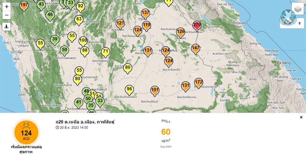 กาฬสินธุ์ – วัยรุ่นหรือคนที่ออกกำลังกายอย่างสม่ำเสมอที่มีสุขภาพแข็งแรงคงจะยังไม่ได้รับผลกระทบต่อสุขภาพ แต่เด็กแรกเกิด ผู้ป่วย หรือผู้สูงอายุ เชื่อว่าหลายคนเริ่มได้รับผลกระทบแล้วกับสภาพมลพิษทางอากาศที่ 6 วันล่าสุด มีค่า PM 2.5 เริ่มมีผลกระทบต่อสุขภาพแล้ว ล่าสุดวันนี้ (20 มี.ค. 2566) ค่า PM 2.5 จากผลการตรวจวัดคุณภาพอากาศในพื้นที่ สำนักงานทรัพยากรธรรมชาติและสิ่งแวดล้อมจังหวัดกาฬสินธุ์ ต.เหนือ อ.เมือง, กาฬสินธุ์ มีค่าอยู่ที่ 60 ไมโครกรัมต่อลูกบาศก์เมตร ติดต่อกันมาเป็นวันที่ 3 ต่อเนื่องแล้ว