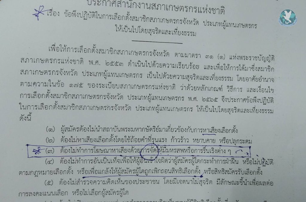 - กรณีผู้สมัครสมาชิกสภาเกษตรกร ประเภทผู้แทนเกษตรกร ขึ้นเวทีหมอลำหาเสียง ตามงานบุญประเพณีของหมู่บ้าน โดยมิได้เป็นผู้จัดให้มีการแสดงหมอลำนั้น อาจไม่เข้าข่ายความผิดตาม ประกาศสำนักงานสภาเกษตรกรแห่งชาติ เรื่อง ข้อพึงปฏิบัติในการเลือกตั้งสมาชิกสภาเกษตรกรจังหวัด ประเภทผู้แทนเกษตรกรให้เป็นไปโดยสุจริตและเที่ยงธรรม (3) ต้องไม่ทำการโฆษณาหาเสียงด้วยการจัดให้มีมหรสพหรือการรื่นเริงต่างๆ