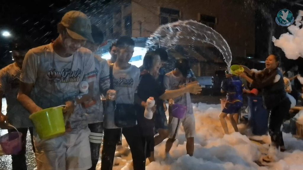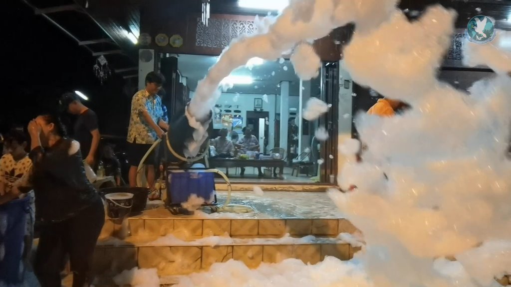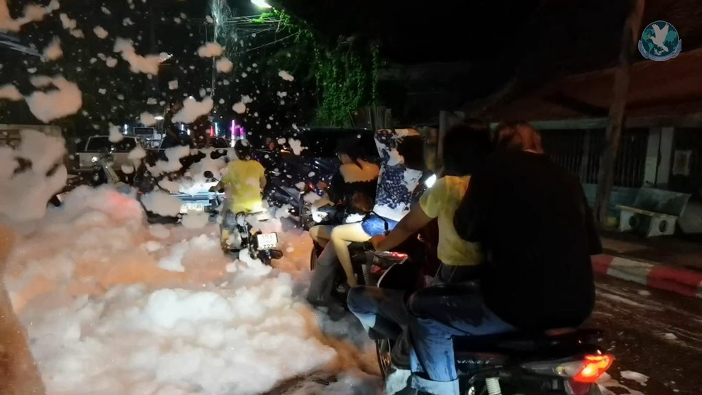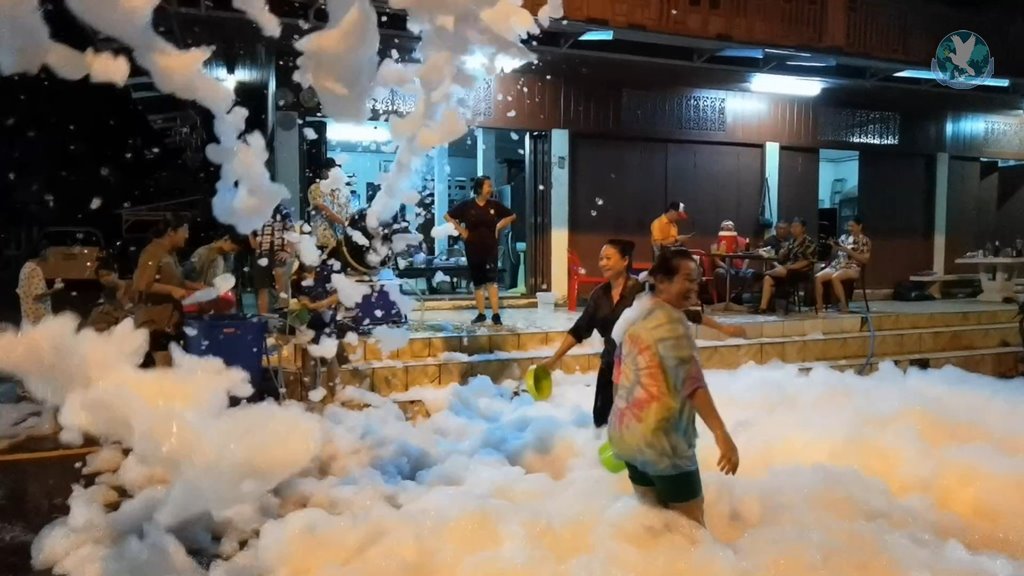 บางกลุ่มจัดหนัก จัดเต็ม ประดิษฐ์เครื่องพ่นฟองสบู่ตั้งอยู่มุมสี่แยกหลังวัดกลางพระอารามหลวง ฉีดพ่นใส่นักท่องเที่ยวที่ขับรถผ่าน บางคนอดใจไม่ได้ อยากย้อนวัย ถึงกับจอดรถลงมามุดกองฟองสบู่อย่างเป็นเด็ก ถือว่าเป็นของเล่นใหม่ของสงกรานต์ปีนี้ สร้างบรรยากาศให้ทุกคนที่ผ่านสนุกสนานเป็นอย่างมาก