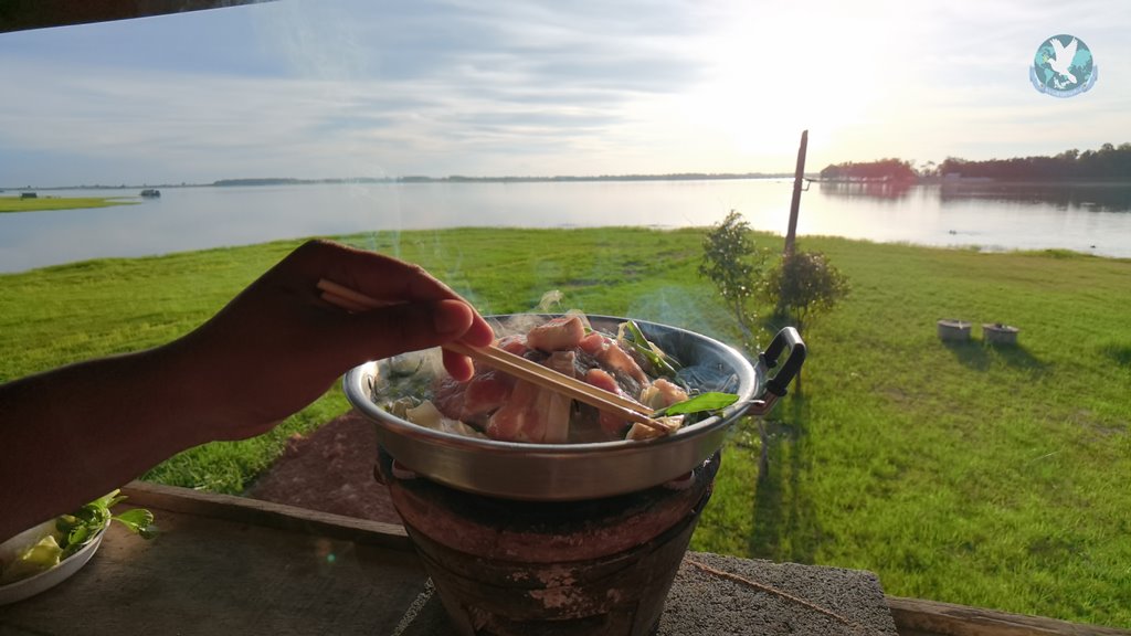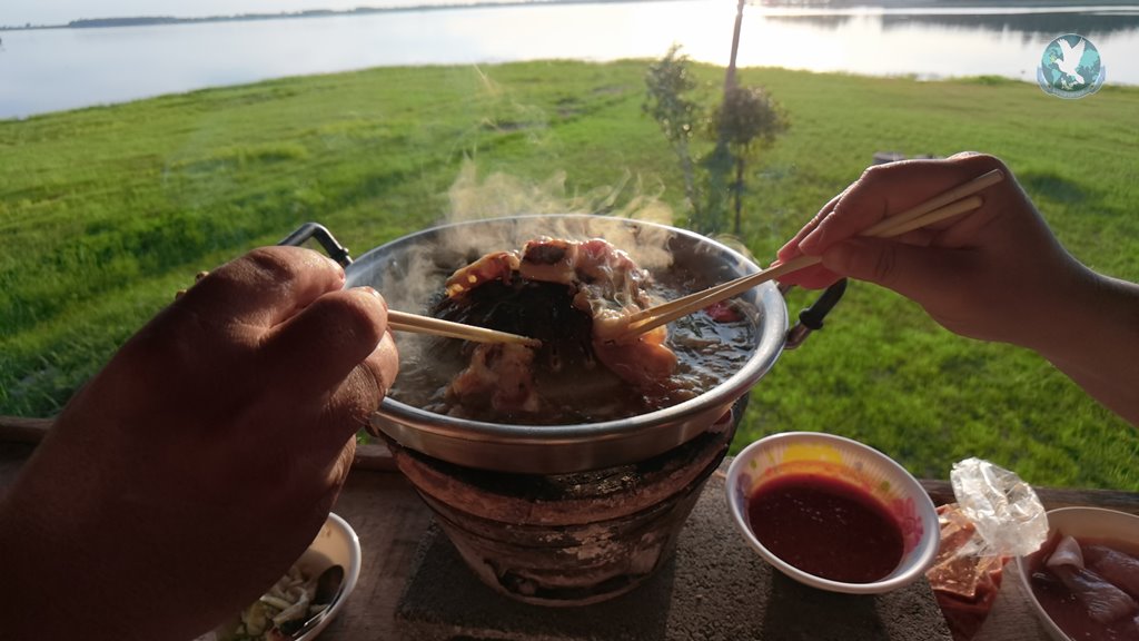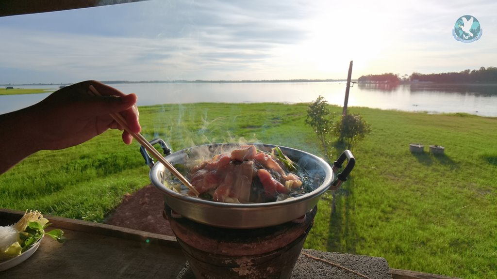 แต่ระหว่างที่แก๊งค์นี้รอชมพระอาทิตย์ตกดิน เหลือเวลาอีกนานหลายชั่วโมง ประกอบกับหลายๆ คนเริ่มท้องร้องหิวข้าวหนักด้วย ก็เลยสั่งหมูกระทะร้านเด็ดในย่านนี้มากินรองท้องรอ ของร้านบุญทองสัมฤทธิ์ หมูกระทะ ซึ่งขณะกำลังย่างหมูกระทะอยู่นั้น สภาพอากาศก็ยังร้อนจัดอยู่ จึงทำให้สมาชิกแก๊งค์นี้สู้ชีวิตอย่างหนัก ย่างหมูไปด้วย เช็ดเหงื่อไปด้วย จนสมาชิกคนหนึ่งถึงกับต้องถอดเสื้อกิน เหมือนเนื้อหมูจะสุกเพราะไฟจากเตาถ่านด้วย พร้อมกับได้พลังงานแสงอาทิตย์ (หมูกระทะพลังงานแสงอาทิตย์) ช่วยเร่งความสุกอีกแรง แต่ด้วยความหิวและรสชาตน้ำจิ้มสูตรเด็ดของร้านนี้ ทำให้ทุกคนต่างทานหมูกระทะได้อย่างเอร็ดอร่อย