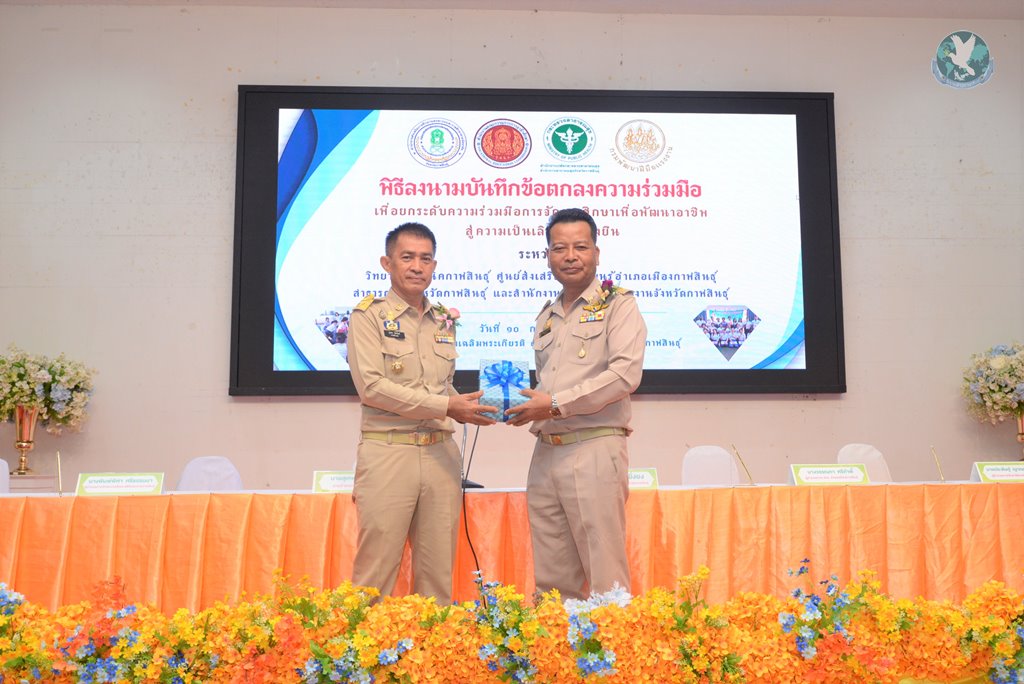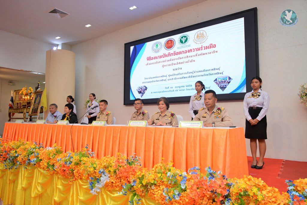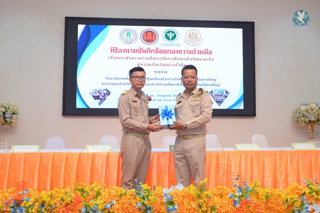 วันที่ 10 ก.ค. 2566 ณ หอประชุมเฉลิมพระเกียรติ 84 พรรษา วิทยาลัยเทคนิคกาฬสินธุ์ จัดพิธีลงนามบันทึกข้อตกลงความร่วมมือ (MOU) และพิธีเปิดโครงการนวดไทยเพื่อสุขภาพ เพื่อยกระดับความร่วมมือการจัดการศึกษา เพื่อพัฒนาอาชีพสู่ความเป็นเลิศอย่างยั่งยืน ระหว่างวิทยาลัยเทคนิคกาฬสินธุ์ ศูนย์ส่งเสริมการเรียนรู้อำเภอเมืองกาฬสินธุ์ สาธารณสุขจังหวัดกาฬสินธุ์ และสำนักงานพัฒนาฝีมือแรงงานจังหวัดกาฬสินธุ์ โดยมีนายสุเทพ ชัยวัฒน์ นายอำเภอเมืองกาฬสินธุ์ เป็นประธานในพิธี พร้อมด้วย นายแพทย์วิทยา วัฒนเรืองโกวิท นายแพทย์สาธารณสุขจังหวัดกาฬสินธุ์, นางพรทิพย์พา คาวีวงศ์ ผู้อำนวยการสำนักงานส่งเสริมการเรียนรู้จังหวัดกาฬสินธุ์, นางพิมพ์พิศา ศรีธรรมมา ผู้อำนวยการสำนักงานพัฒนาฝีมือแรงงานจังหวัดกาฬสินธุ์, นางวรรณภา ศรีกำพี้ ผู้อำนวยการศูนย์ส่งเสริมการเรียนรู้อำเภอเมืองกาฬสินธุ์, นายประดิษฐ์ ญาณประเสริฐ ผู้อำนวยการวิทยาลัยเทคนิคกาฬสินธุ์ ผู้เข้าอบรม คณะครู บุคลากร และนักศึกษาวิทยาลัยเทคนิคกาฬสินธุ์ เข้าร่วมพิธีอย่างพร้อมเพรียง
