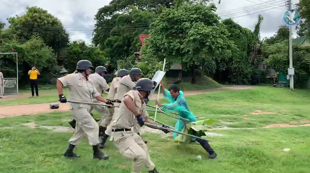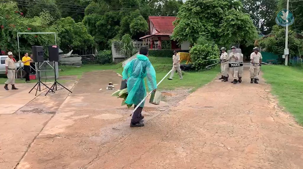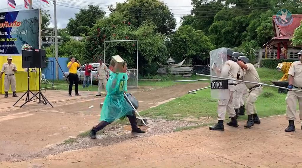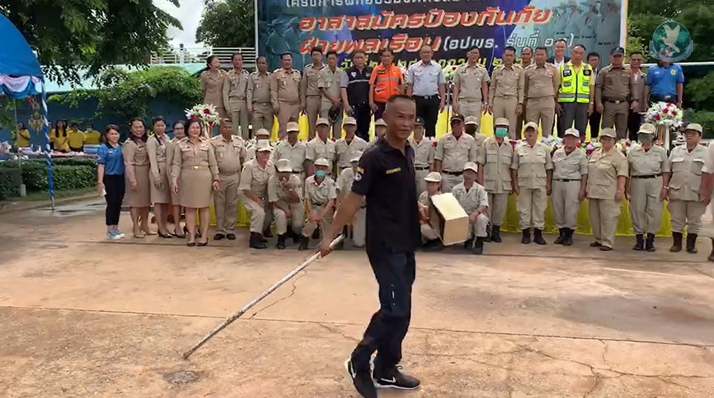 ภายหลังจากพิธีเปิด ยังมีการสาธิตยุทธวิธีในการปราบปรามผู้ก่อการร้าย โดยการใช้ไม้ง่ามเข้าระงับเหตุด้วยรูปแบบการรักษาความปลอดภัยจาก อปพร.รุ่นที่ผ่านการฝึกอบรมมาแล้ว หลังจากนั้นประธานในพิธีและคณะได้เดินตรวจแถวเพื่อให้กำลังใจและขอให้ผู้เข้ารับการฝึกอบรมทุกนายได้ตั้งใจฝึกอย่างจริงจัง เพื่อเป็นกำลังสนับสนุนด้านการรักษาความปลอดภัย และจะได้เป็นหน่วยดูแลเฝ้าเครื่องสูบน้ำตามจุดต่าง ๆ ในเขตเทศบาลเมืองกาฬสินธุ์ เพราะคาดว่าจะมีน้ำฝนตกลงมามากในช่วงเดือนสิงหาคมนี้ ซึ่งอาจจะส่งผลให้เกิดปัญหาน้ำท่วมฉับพลันและน้ำรอระบายตามชุมชนในเขตเทศบาลเมืองกาฬสินธุ์อย่างทุกปีที่ผ่านมาก็เป็นไปได้