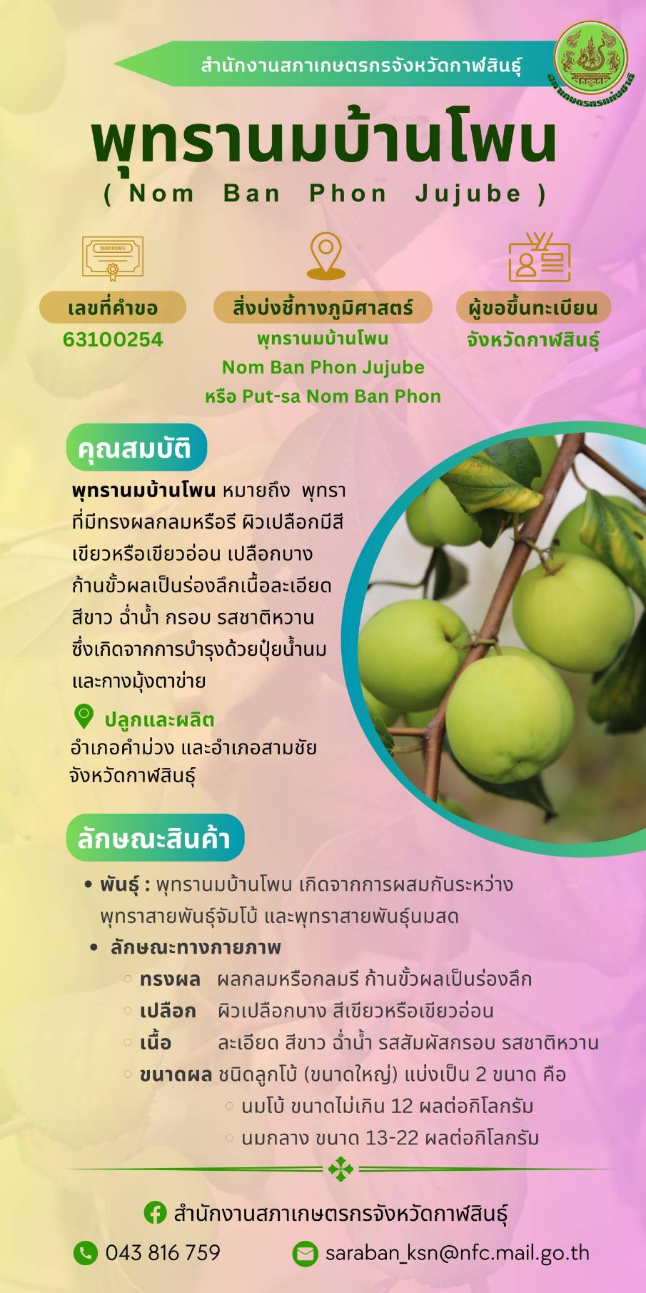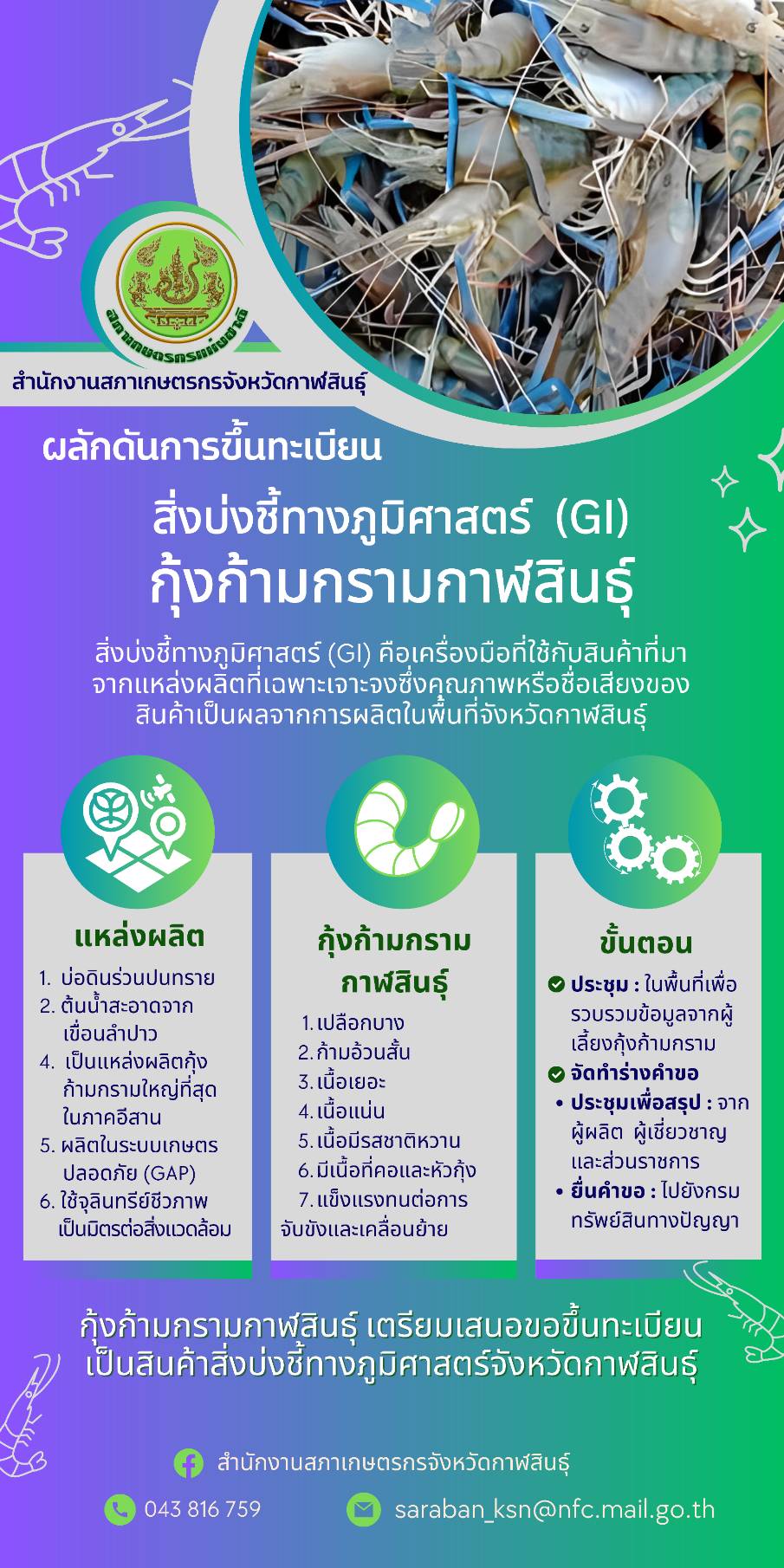 ดร.นิรุจน์ อุทธา หัวหน้าสำนักงานสภาเกษตรกรจังหวัดกาฬสินธุ์ กล่าวว่า สำนักงานสภาเกษตรกรจังหวัดกาฬสินธุ์ ได้กำหนดพันธกิจขับเคลื่อนการขึ้นทะเบียนสินค้าเกษตรเป็นสิ่งบ่งชี้ทางภูมิศาสตร์ (Geographical Indication/GI) ตามยุทธศาสตร์กาฬสินธุ์สมาร์ทกรีนซิตี้ (Kalasin Smart Green City) จำนวน 4 รายการ ได้แก่ พุทรานมบ้านโพน, มะม่วงมหาชนกกาฬสินธุ์, กุ้งก้ามกรามกาฬสินธุ์ และมะพร้าวน้ำหอมภูสิงห์กาฬสินธุ์ ประสบผลสำเร็จแล้ว 1 รายการ คือ พุทรานมบ้านโพน โดยกรมทรัพย์สินทางปัญญา ได้ขึ้นทะเบียนคำขอเลขที่ 63100254 เมื่อปี พ.ศ. 2563 เป็นพุทรา GI ที่ปลูกในพื้นที่อำเภอคำม่วง และอำเภอสามชัย ส่วนสินค้าเกษตรอีก 3 รายการ ได้แก่ มะม่วงมหาชนกกาฬสินธุ์, กุ้งก้ามกรามกาฬสินธุ์ และมะพร้าวน้ำหอมภูสิงห์กาฬสินธุ์ จังหวัดกาฬสินธุ์ โดยคณะทำงานพิจารณาคำขอ ตรวจสอบ ควบคุมคุณภาพ และแหล่งที่มาของสินค้าสิ่งบ่งชี้ทางภูมิศาสตร์จังหวัดกาฬสินธุ์ กำลังอยู่ระหว่างการดำเนินการเก็บรวมรวมข้อมูลเอกสารทางวิชาการฯ ที่ประชุมจึงได้คัดเลือกผลงานเด่น การขับเคลื่อน GI ที่ประสบผลสำเร็จแล้ว จำนวน 1 รายการคือ พุทรานมบ้านโพน และที่กำลังดำเนินการอีกจำนวน 1 รายการ คือ กุ้งก้ามกรามกาฬสินธุ์ เนื่องจาก กาฬสินธุ์เป็นแหล่งผลิตกุ้งก้ามกราม (HUB) ที่ใหญ่ที่สุดในพื้นที่ภาคตะวันออกเฉียงเหนือ และเป็นอาหาร Signature ของจังหวัดฯ ที่ว่า “มากาฬสินธุ์ต้องกินกุ้งก้ามกราม” เพื่อส่งเสริมการท่องเที่ยวเชิงวัฒนธรรมการเกษตรไปพร้อมกัน