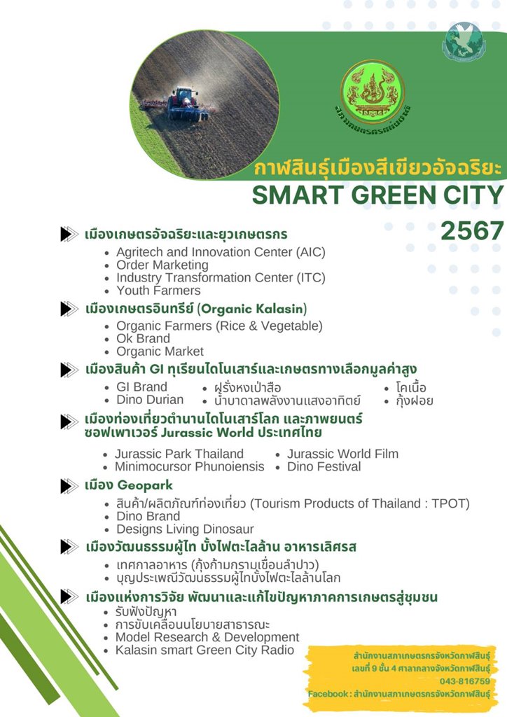 ตามที่ สำนักงานสภาเกษตรกรจังหวัดกาฬสินธุ์ โดย ดร.นิรุจน์ อุทธา หัวหน้าสำนักงานฯ พร้อมคณะ ได้ยกร่าง ยุทธศาสตร์กาฬสินธุ์เมืองสีเขียวอัจฉริยะ ปี 2567 ตามคำแนะนำของ นายวุฒิพงษ์ พลอยวิเลิศ ประธานสภาเกษตรกรฯกาฬสินธุ์ พร้อมด้วย นายณัฐพล พรมช่วย และนางบงกช ผิวคำ รองประธานสภาฯ เพื่อนำเสนอขอความเห็นชอบต่อที่ประขุมสภาเกษตรกรจังหวัดกาฬสินธุ์ ครั้งที่ 1/2567 ตามขั้นตอนของ พรบ.สภาเกษตรกรแห่งชาติ พ.ศ.2553 ก่อนนำไปขับเคลื่อนสู่การปฏิบัติ โดยแผนยุทธศาสตร์กาฬสินธุ์เมืองสีเขียวอัจฉริยะ 2567 ประกอบด้วย แนวคิด 1.นโยบายรัฐบาลตลาดนำ นวัตกรรมเสริม เพิ่มรายได้ 2.นโยบายสภาเกษตรกรแห่งชาติ พัฒนาอาชีพเกษตรกรเป็นกำลังสำคัญในการสร้างเศรษฐกิจของประเทศ 3.นโยบายพัฒนาจังหวัดฯ 20 ปีมุ่งสู่เมืองเศรษฐกิจสร้างสรรค์ เกษตรมูลค่าสูง การท่องเที่ยวหลากหลาย และเมือง Geopark ผสมผสานกับประเด็น การขับเคลื่อนเมืองเกษตรอินทรีย์ ซอฟเพาเวอร์จูราสสิคเวิร์ล ประเทศไทย การเกษตรที่เป็นมิตรต่อสิ่งแวดล้อม และการบ่มเพาะยุวเกษตรกรสู่เกษตรยุคใหม่ รองรับการค้า การแข่งขันแห่งอนาคต โดยมีวิสัยทัศน์ว่า กาฬสินธุ์เป็นเมืองต้นแบบเกษตรอัจฉริยะและเมืองยุวเกษตรกรของประเทศ ภายในปี 2567 ประกอบด้วย 7 ประเด็นยุทธศาสตร์ ได้แก่ 1.เมืองเกษตรอัจฉริยะ(Smart Farming) และยุวเกษตรกร(Youth Farmer) 2.เมืองเกษตรอินทรีย์(Organic Kalasin หรือ OK) 3.เมืองสินค้า GI ทุเรียนไดโนเสาร์ เกษตรกรรมมูลค่าสูง(โคเนื้อ ฝรั่งหงเป่าสือ กุ้งฝอย) และสนับสนุนน้ำบาดาลพลังงานแสงอาทิตย์ให้เพียงพอต่อการผลิต 4.เมืองท่องเที่ยวซอฟเพาเวอร์ภาพยนตร์ตำนานไดโนเสาร์โลก (Jurassc World Film) 5.เมือง Geopark และสินค้าท่องเที่ยว TPOT(Tourism Product of Thailand) 6.เมืองวัฒนธรรมผู้ไท บั้งไฟตะไลล้านและอาหารเลิศรส 7.เมืองการวิจัยพัฒนานวัตกรรมต้นแบบแก้ปัญหาเกษตรกรในชุมชน โดยที่ประชุมสภาฯ มีมติเห็นชอบอย่างเป็นเอกฉันท์ และได้แต่งตั้งคณะทำงานขับเคลื่อนยุทธศาสตร์ฯดังกล่าว จำนวน 5 คณะ