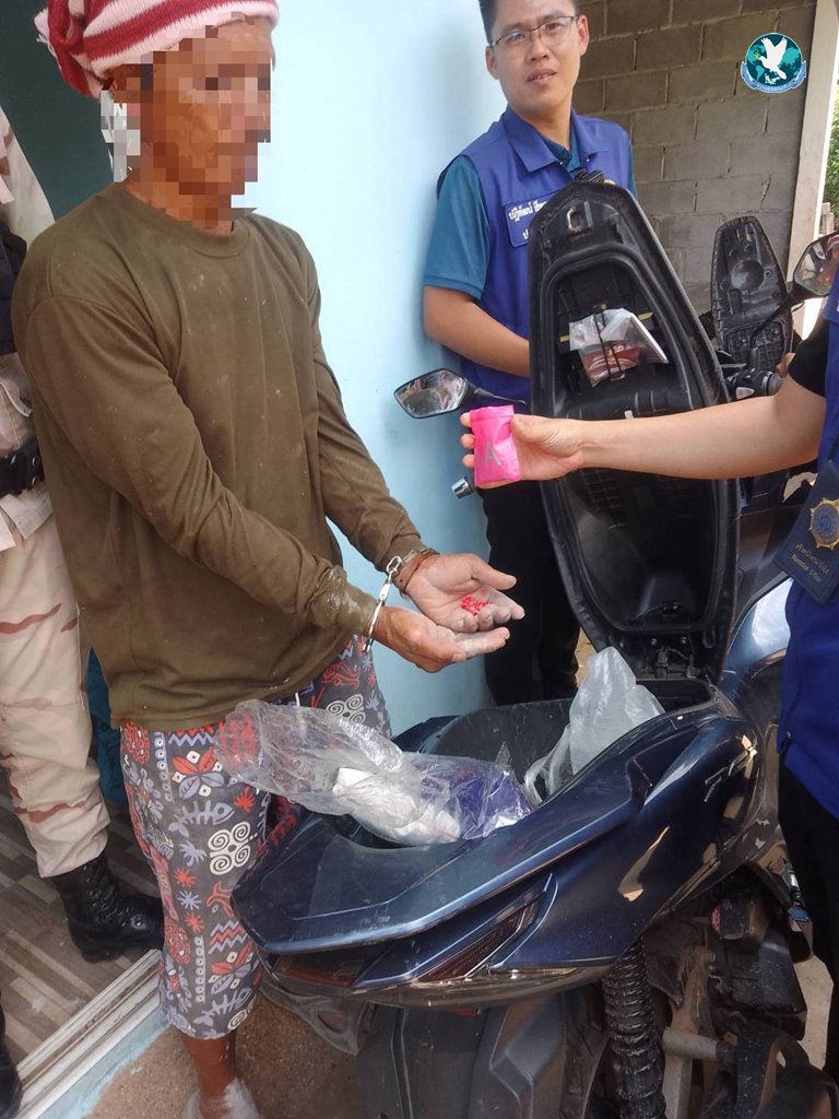 3. นาง D (นามสมมุติ) อายุ 45 ปี ตรวจปัสสาวะผลเป็นบวกและขณะทำการตรวจค้นพบพร้อมของกลาง เป็นยาบ้า จำนวน 30 เม็ด