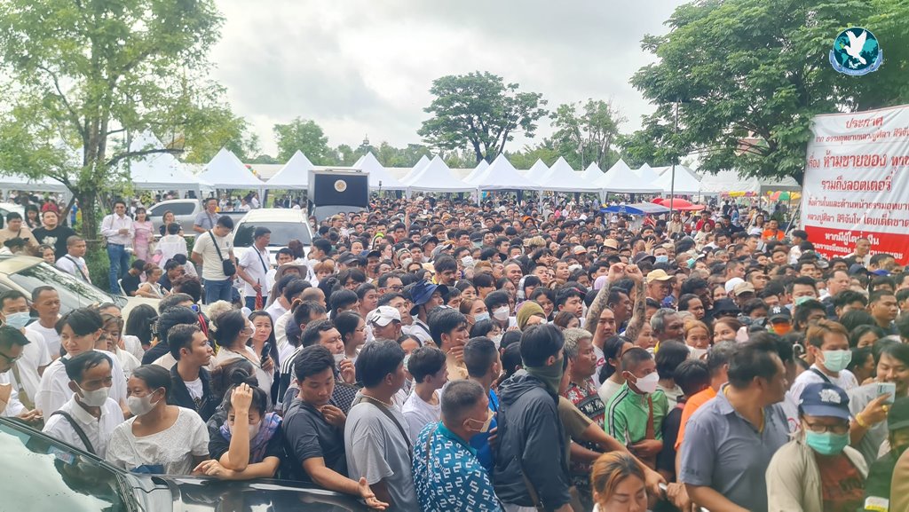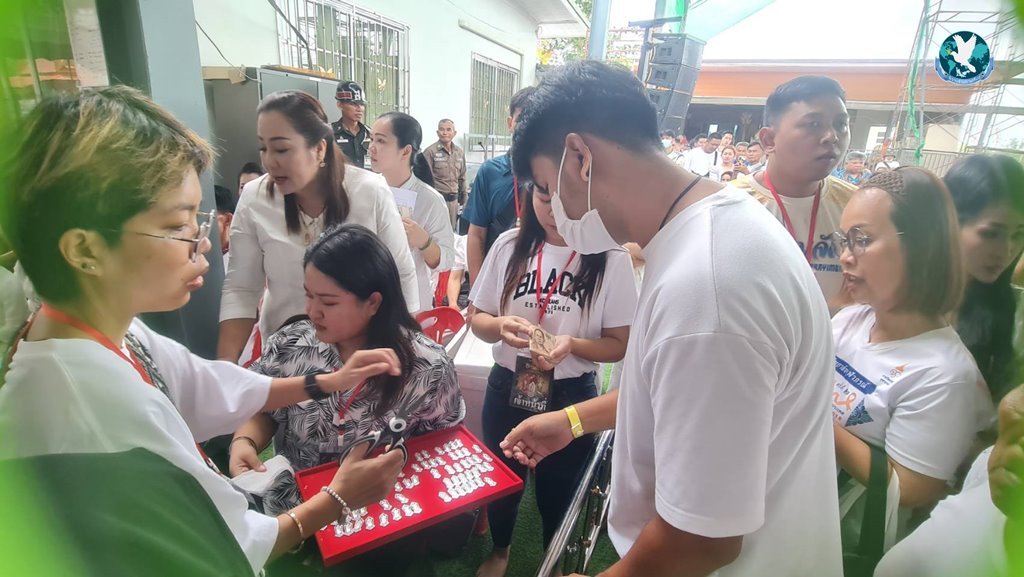 คุณเทวราช ประดับคำ (แขวนป้ายชื่อสีแดง) ตัวแทนลูกศิษย์ก้นกุฎิและกรรมการธรรมอุทยาน กล่าวว่า วันนี้มีพี่ๆ ทหารมาช่วยดูแล มีความเรียบร้อยดี จึงขอขอบคุณพี่ๆ สห. จากมทบ.ด้วย โดยขั้นตอนในการจองเหรียญในวันนี้เราแจกบัตรชัดเจน จำนวน 500 ใบ เอามาจับสลากหาผู้โชคดีจำนวน 99 คน ที่จะได้เหรียญนำฤกษ์ “รุ่นยอดรวยรวย” โดยได้รับความอนุเคราะห์จากพี่ๆ ทหารมาจัดระเบียบอย่างชัดเจน ซึ่งทางลูกศิษย์และคณะกรรมการจะไม่ได้เข้าไปยุ่งเกี่ยวกับส่วนนี้ เป็นความโปร่งใสของธรรมอุทยาน ทุกท่านไม่ต้องกลัวว่าไม่ชัดเจน ที่นี่เรายืนยันว่าจัดระเบียบระบบจัดเจน 100%