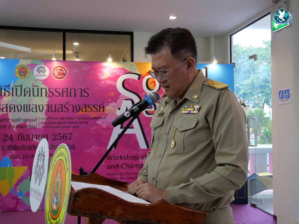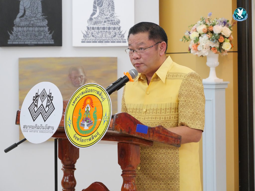 นายนพสิทธิ์ กุลเจริญวิรัตน์ รองนายกเทศมนตรีเมืองกาฬสินธุ์ กล่าวว่า ตามที่ เทศบาลเมืองกาฬสินธุ์ร่วมกับสมาคมศิลปินอีสาน ได้กำหนดจัดกิจกรรม “อบรมเชิงปฏิบัติการสร้างสรรค์ Workshop ด้านศิลปกรรม” ภายใต้โครงการขับเคลื่อนการดำเนินงานพิพิธภัณฑ์และแหล่งเรียนรู้เทศบาลเมืองกาฬสินธุ์ ประจำปีงบประมาณ พ.ศ. 2567 ขึ้นระหว่างวันที่ 1 – 2 สิงหาคม 2567 ที่ผ่านมา ณ โรงแรมริมปาว จังหวัดกาฬสินธุ์ โดยกลุ่มเป้าหมายศิลปินแห่งชาติ ศิลปินจากในประเทศ และเด็กเยาวชน เข้าร่วมกิจกรรมนั้น ในการนี้ เทศบาลเมืองกาฬสินธุ์ ได้จัดแสดงผลงานที่ได้จากกิจกรรมอบรมเชิงปฏิบัติการดังกล่าว ระหว่างวันที่ 5 – 25 กันยายน 2567 ณ พิพิธภัณฑ์หอศิลป์กาฬสินธุ์ เพื่อขับเคลื่อนพิพิธภัณฑ์หอศิลป์กาฬสินธุ์ ให้บรรลุตามแผนยุทธศาสตร์พัฒนาเมือง “วิถีศิลป์ ถิ่นวัฒนธรรม” เป็นศูนย์กลางการท่องเที่ยว ส่งเสริมพัฒนาด้านศิลปวัฒนธรรม ภูมิปัญญาท้องถิ่น การมีส่วนร่วมในการอนุรักษ์ส่งเสริมศิลปวัฒนธรรมของประเทศ ชุมชน สังคม ให้เข้มแข็ง และเพื่อเป็นการขับเคลื่อนพื้นที่การเรียนรู้เทศบาลเมืองกาฬสินธุ์ ยกระดับการพัฒนาเศรษฐกิจท้องถิ่นรวมทั้งการเรียนรู้ในมิติทางศิลปวัฒนธรรม ประวัติศาสตร์ท้องถิ่น จึงได้จัดงานในวันนี้ขึ้นมา