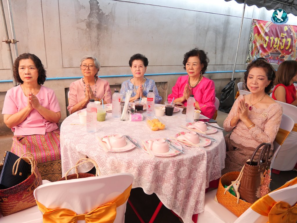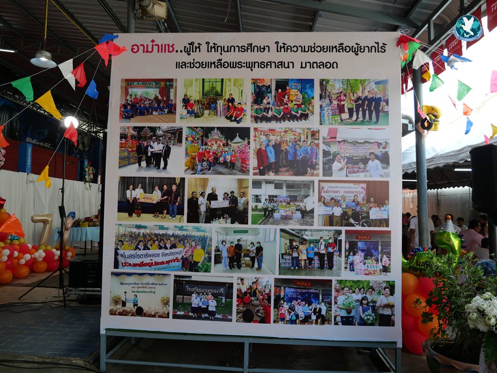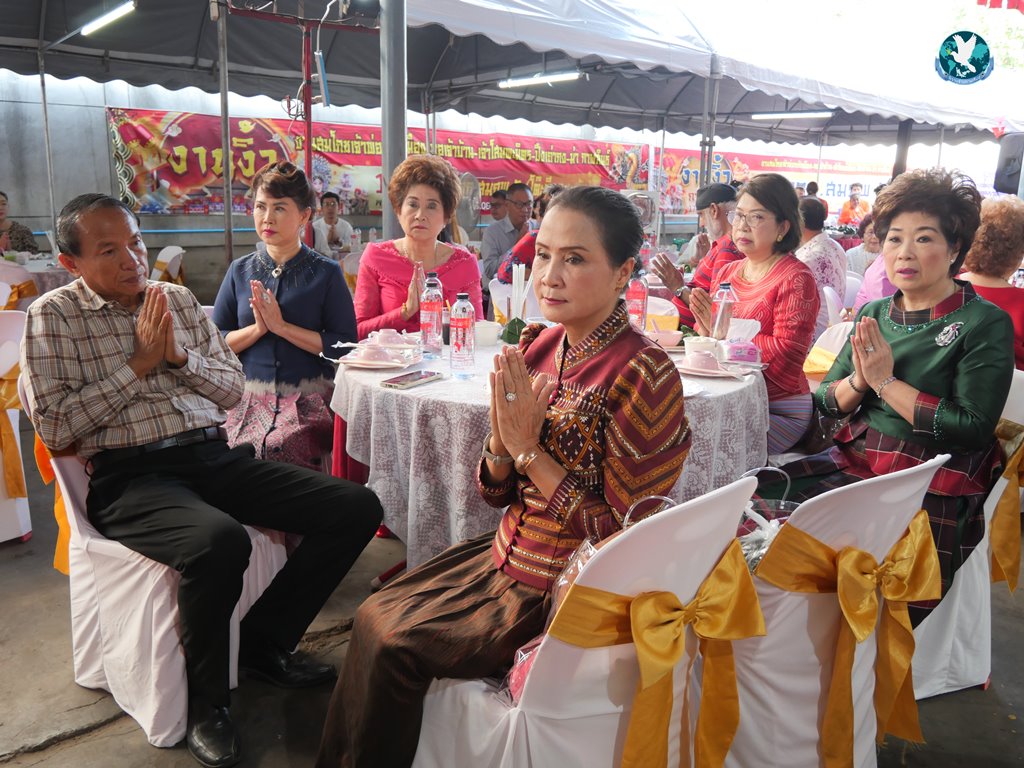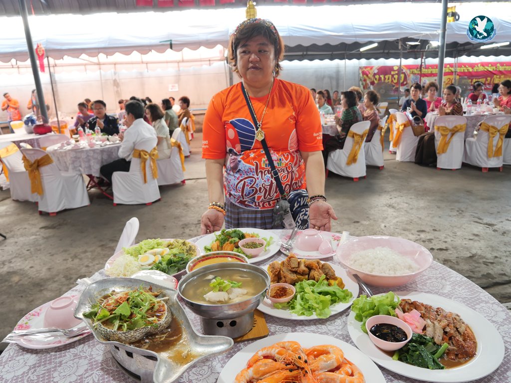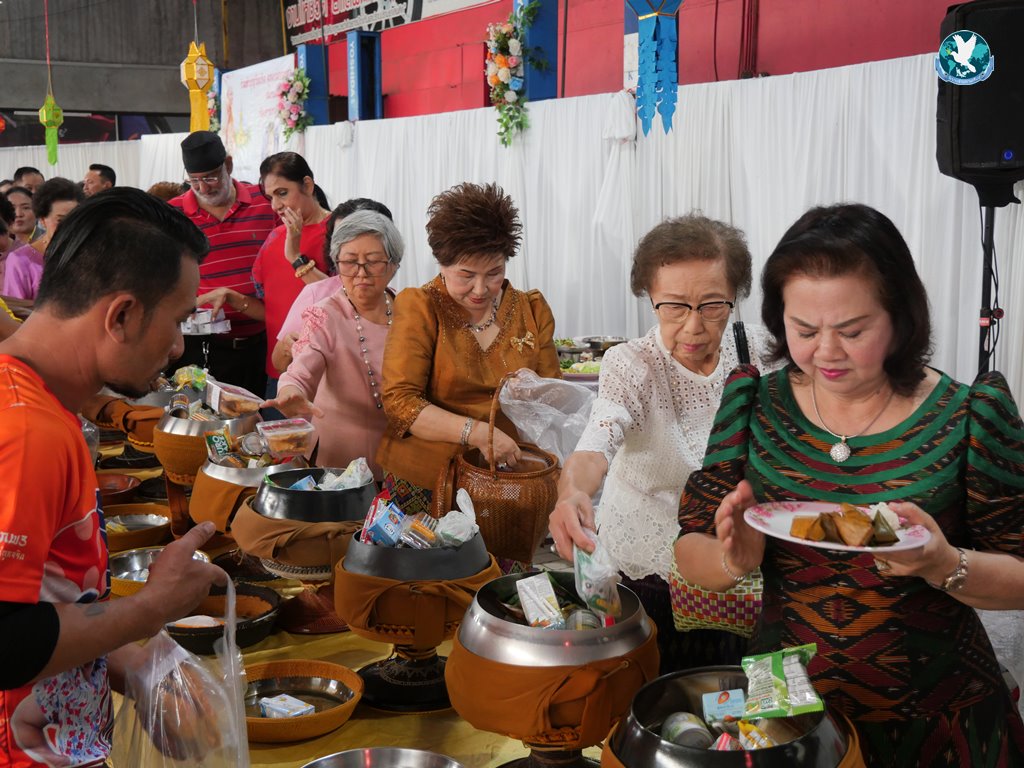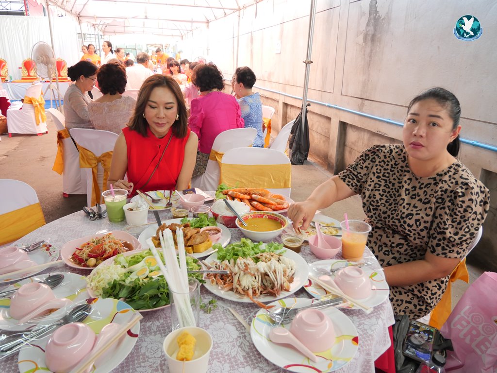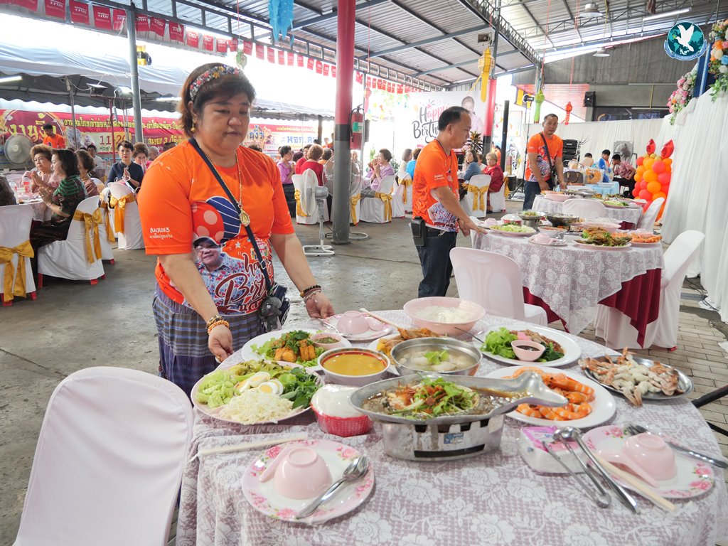 สีสันแรกของวันนี้ เนื่องจากอาม๋าแช เป็นเจ้าของห้องอาหารชื่อดังของจังหวัดกาฬสินธุ์ ที่รับจัดโต๊ะจีนตามงานพิธีต่าง ๆ มากว่า 40 ปี วันนี้เป็นวันเกิดของเจ้าของห้องอาหารเอง จึงจัดโต๊ะจีนที่คัดสรรวัตถุดิบอย่างดีมาเสริฟถวายภัตตาหารแด่พระภิกษุสงฆ์และแขกผู้มีเกียรติที่เข้าร่วมงาน ไม่ว่าจะเป็นเมนู ปลาหิมะนึ่งซีอิ้ว, ซุปหูฉลามน้ำแดงปู, กุ้งนึ่งน้ำจิ้มซีฟู้ด, ปูม้านึ่งแกะ, เป็ดอบน้ำผึ้ง, เต้าหู้+กวงเจียงเผือกทอด, ขนมจีนน้ำยาปูก้อน, ปลากะพงทอดลุยสวน และออเดริฟ (แคปหมู+หมูกรอบ+น้ำพริก+ส้มตำ) ..ดูไปกลืนน้ำลายไป.. ไม่เชื่อก็ดูเลยว่าอร่อยจนแขกที่เข้าร่วมงานขอห่อกลับบ้านด้วย