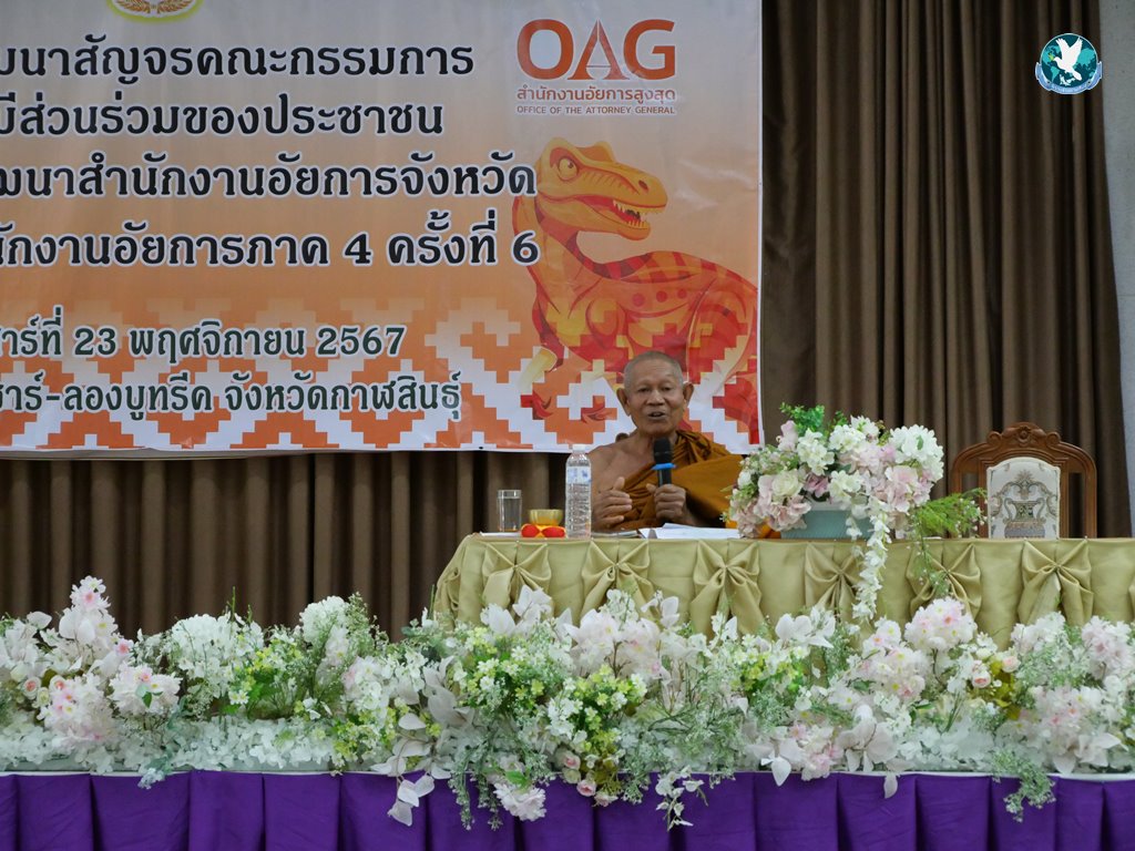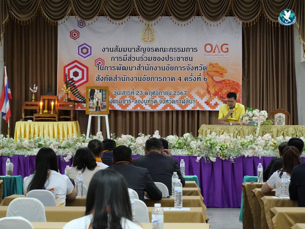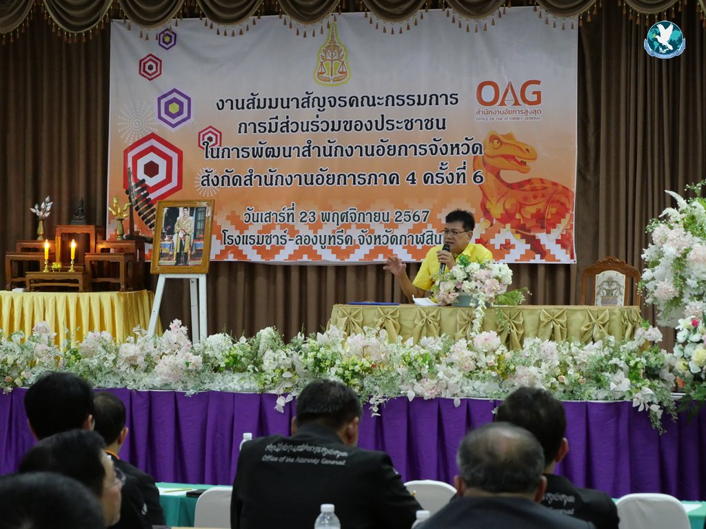 กาฬสินธุ์ สำนักงานอัยการจังหวัดกาฬสินธุ์ เป็นเจ้าภาพจัดงานสัมมนาสัญจรคณะกรรมการการมีส่วนร่วมของประชาชน ในการพัฒนาสำนักงานอัยการจังหวัด สังกัดสำนักงานอัยการภาค 4 ครั้งที่ 6 ส่งต่อธงเจ้าภาพ ค.พ.อ. ค.ป.อ. ภาค 4 สำนักงานอัยการสูงสุด ให้จังหวัดเลยเป็นเจ้าภาพครั้งที่ 7 ต่อไป