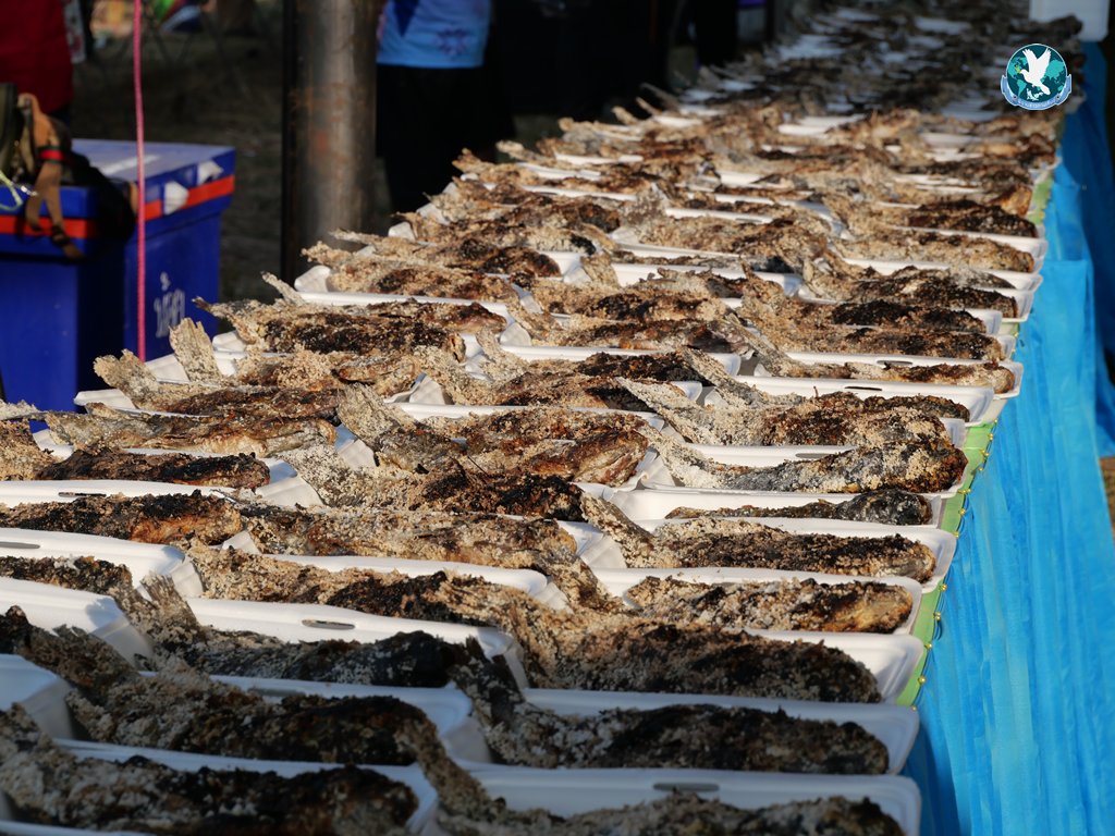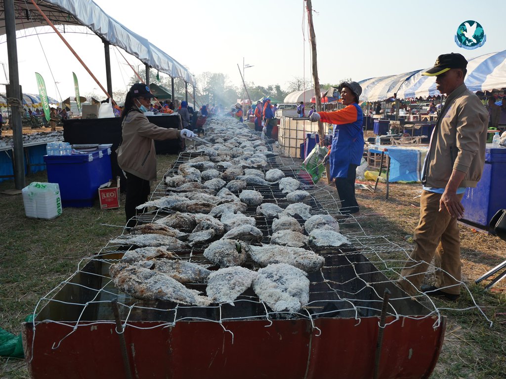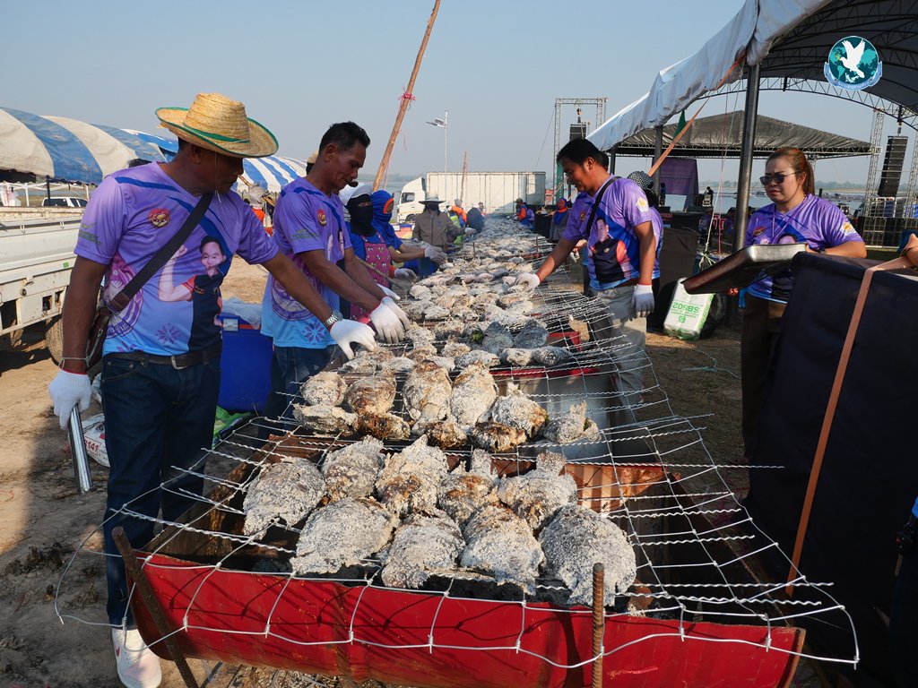 กาฬสินธุ์ มองเห็นภาพปลานิลสดตัวโตๆ น้ำหนักตัวละประมาณ 1 กก. ที่ถูกน็อคด้วยการโรยด้วยเกลือ นำมาย่างบนเตาถ่านไฟอ่อนๆ อย่างพิถีพิถัน จำนวนกว่า 1 พันตัว หรือน้ำหนักรวม 1 ตัน บนเตาถ่านที่คาดว่าเป็นเตาย่างปลานิลที่ใหญ่และยาวที่สุดในโลก ด้วยความร่วมแรงร่วมใจของคนในชุมชน เพื่อนำมาแจกจ่ายให้ฟรีกับประชาชนในพื้นที่ได้รับประทานปลานิลเผารสชาติดี จากแหล่งต้นกำเนิดปลานิลในกระชังที่ใหญ่ที่สุดในจังหวัดกาฬสินธุ์ และกุ้งก้ามกรามที่อร่อยที่สุดในโลก