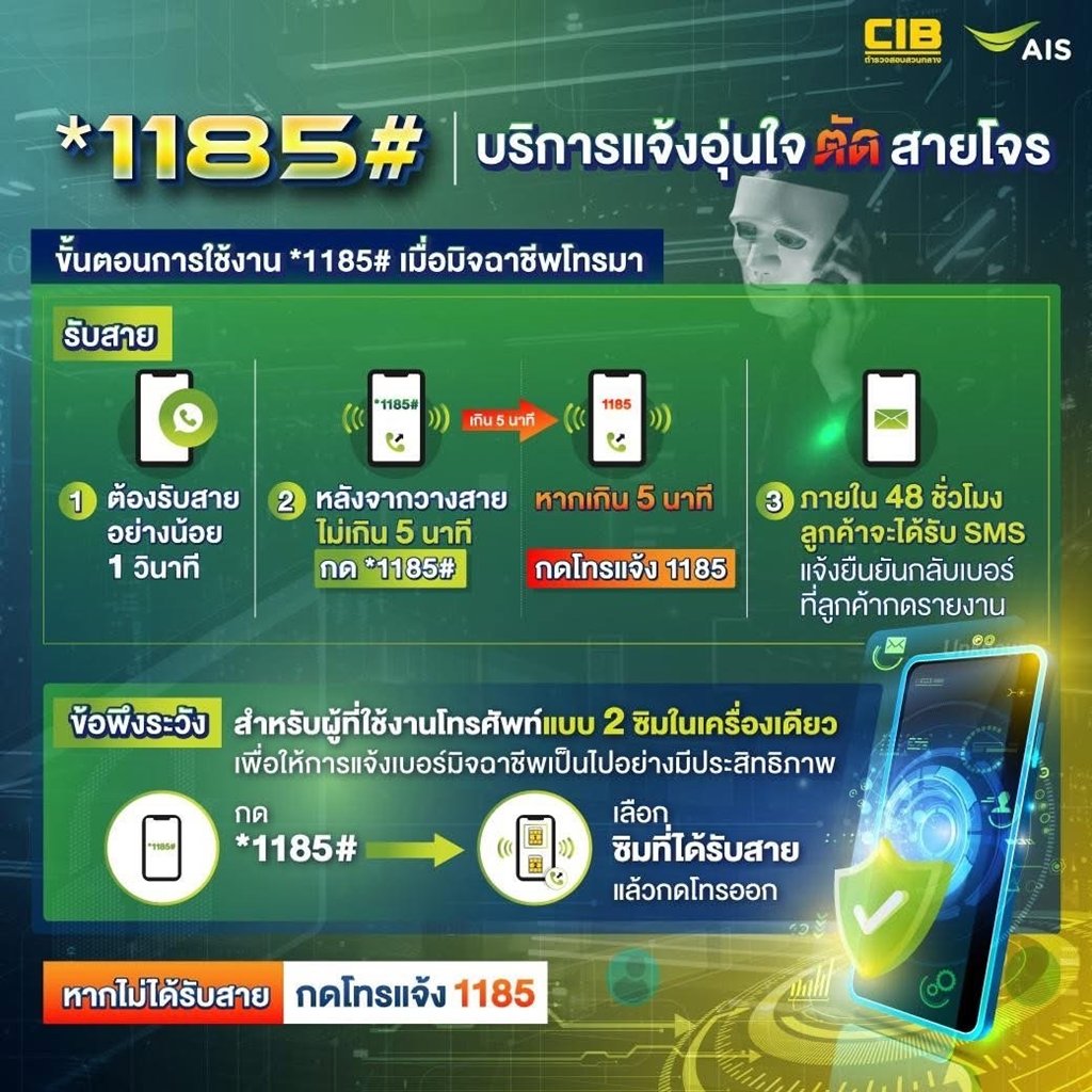 - การแก้ไข AIS ร่วมมือกับ ตำรวจสอบสวนกลางCIB และ ตำรวจไซเบอร์ (CCIB) ยกระดับการปกป้องลูกค้า และ ประชาชน จากมิจฉาชีพต่อเนื่องไปอีกขั้น เปิดตัวบริการ *1185# แจ้งอุ่นใจ ตัดสายโจร โดยเมื่อลูกค้า AIS รับสายเบอร์โทรมิจฉาชีพ (ที่ใช้เบอร์ค่ายไหนก็ได้) หลังวางสาย สามารถส่งแจ้งเบอร์มิจฉาชีพดังกล่าวไปเข้าสู่กระบวนการตรวจสอบของตำรวจสอบสวนกลางได้ทันที ง่ายๆ เพียงกด *1185# โทรออก บริการฟรี ตลอดเวลา ทุกครั้งที่รับสายมิจฉาชีพ