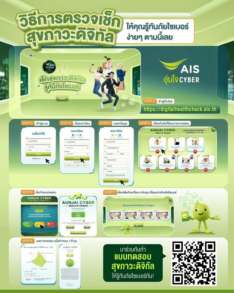 สำหรับผู้สนใจวิเคราะห์และประเมินทักษะด้านดิจิทัลของตนเอง พร้อมทั้งแนะนำช่องทางการเรียนรู้ที่เหมาะสมกับแต่ละบุคคล เพื่อเสริมสร้างทักษะและองค์ความรู้ในการป้องกันภัยไซเบอร์ ผ่านทางเว็บไซต์ digitalhealthcheck.ais.th