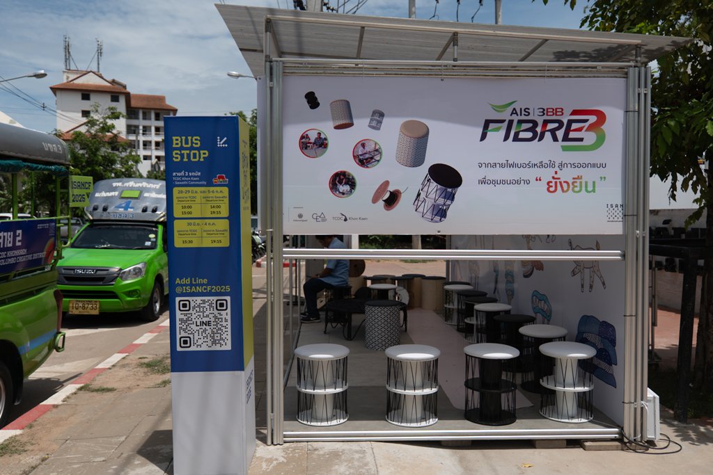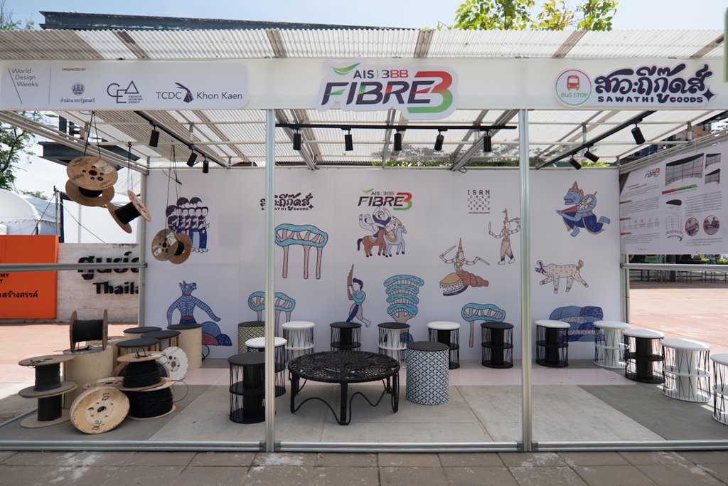 นายธยานนท์ วิเศษจิตเลิศ Head of BB Area Management 3 AIS 3BB FIBRE3 กล่าวว่าตลอดระยะเวลาที่ผ่านมา AIS 3BB FIBRE3 เราเชื่อว่าขีดความสามารถของโครงสร้างบรอดแบนด์และอินเทอร์เน็ตจะช่วยยกระดับคุณภาพชีวิตของลูกค้าและคนไทยในทุกบ้าน สอดคล้องกับโครงการนี้ ที่ถือเป็นตัวอย่างของการใช้เทคโนโลยีควบคู่กับความคิดสร้างสรรค์ เพื่อเสริมสร้างความยั่งยืนในระดับชุมชน ด้วยแนวคิดในการนำวัสดุเหลือใช้มาต่อยอดเป็นสินค้าหรือผลิตภัณฑ์ที่จะช่วยเพิ่มโอกาสในการสร้างรายได้ โดย AIS 3BB Fibre3 ได้นำวัสดุเหลือใช้จากกระบวนการติดตั้งอินเทอร์เน็ต เช่น สายไฟเบอร์ออฟติก (Drop‑wire fiber optic) และโรลเก็บสายไฟเบอร์ (Drum) เพื่อนำไปสร้างสรรค์เป็นผลิตภัณฑ์ที่ใช้ได้จริงในชีวิตประจำวัน โดยได้ อาจารย์ ดร.ขาม จาตุรงคกุล อาจารย์ประจำสาขาออกแบบนิเทศศิลป์ คณะศิลปกรรมศาสตร์ มหาวิทยาลัยขอนแก่น เป็นผู้ออกแบบโดยใช้แรงบันดาลใจจากลวดลายท้องถิ่นและเอกลักษณ์วัฒนธรรมอีสานเป็นแกนกลาง ถ่ายทอดเป็นผลงาน “Bus Stop เพื่อชุมชน” นำไปจัดแสดง 2 จุดสำคัญด้วยกัน จุดแรกที่ด้านหน้าศูนย์สร้างสรรค์งานออกแบบ (TCDC) ซึ่งถูกออกแบบให้เป็นจุดพักรอสำหรับผู้เข้าร่วมงาน ได้เห็นถึงผลงานเชิงสร้างสรรค์ ผ่านผลงาน“เก้าอี้อีสาน โชว์พราว” (ISAN Show Proud Stool Chair) ที่นั่งที่ผลิตจากโรลสายไฟเบอร์ตกแต่งด้วยลวดลายท้องถิ่น