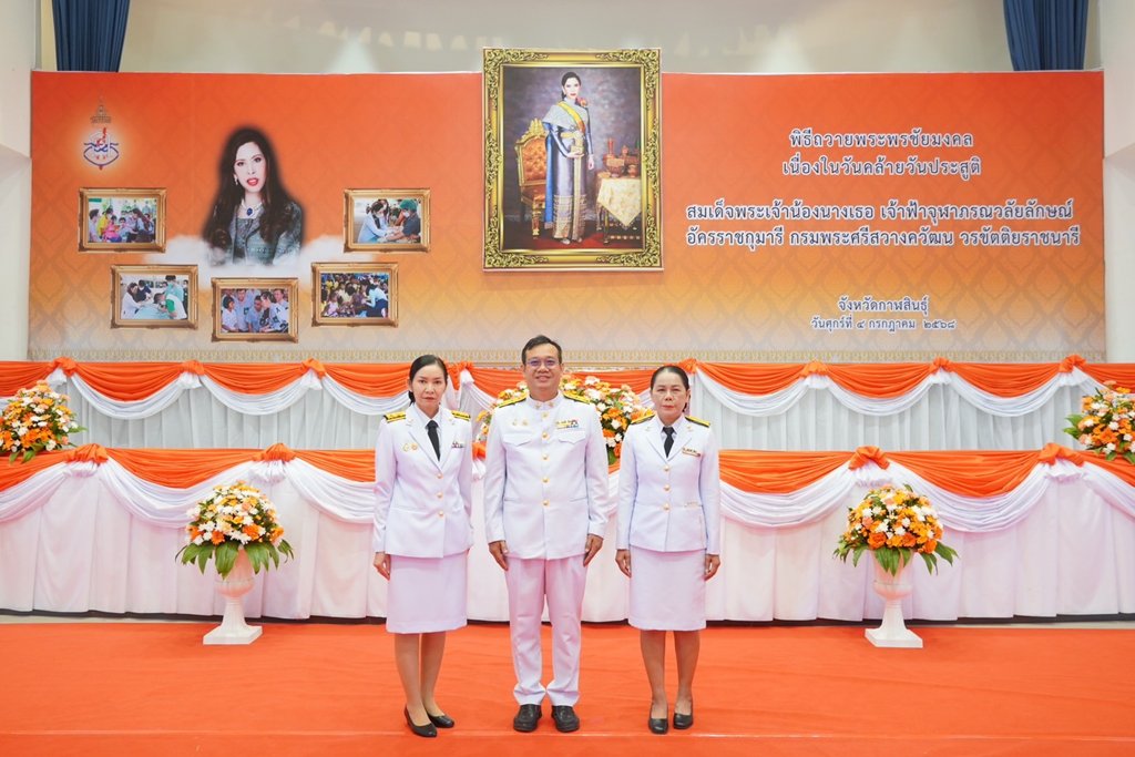 วันที่ 4 กรกฎาคม 2568 แพทย์หญิงจารุพรรณ มโนสิทธิศักดิ์ ผู้อำนวยการโรงพยาบาลกาฬสินธุ์ มอบหมายให้ นายเอื้อการย์ บุตรโพธิ์ศรี รองผู้อำนวยการฝ่ายบริหาร และคณะเจ้าหน้าที่โรงพยาบาลกาฬสินธุ์ ร่วมพิธีทำบุญตักบาตรถวายพระราชกุศล และพิธีถวายพระพรชัยมงคลเนื่องในวันคล้ายวันประสูติสมเด็จพระเจ้าน้องนางเธอ เจ้าฟ้าจุฬาภรณวลัยลักษณ์ อัครราชกุมารี กรมพระศรีสวางควัฒน วรขัตติยราชนารี เพื่อแสดงความจงรักภักดี และสำนึกในพระมหากรุณาธิคุณ ที่ทรงมีต่อพสกนิกรชาวไทย โดยมีนายสนั่น พงษ์อักษร ผู้ว่าราชการจังหวัดกาฬสินธุ์ เป็นประธานในพิธี ณ หอประชุมจังหวัดกาฬสินธุ์ ศูนย์ราชการจังหวัดกาฬสินธุ์ อำเภอเมืองกาฬสินธุ์ จังหวัดกาฬสินธุ์