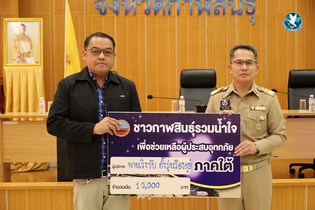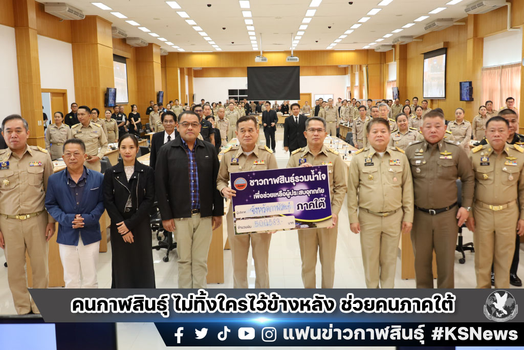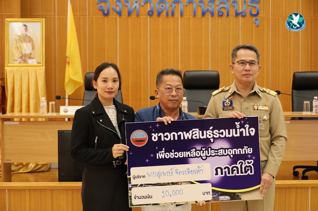 วันที่ 28 พฤศจิกายน 2568 ณ ห้องประชุมโสมพะมิตร ชั้น 4 ศาลากลางจังหวัดกาฬสินธุ์ นายสุวรรธณ์ เข็มธนเพ็ชร รองผู้ว่าราชการจังหวัด รักษาราชการแทนผู้ว่าราชการจังหวัดกาฬสินธุ์ รับมอบเงินสดจาก นายเริงชัย ตั้งรุ่งเรืองอยู่ จำนวน 10,000 บาท นายสุรพงษ์ จิตรเพียรค้า จำนวน 10,000 บาท และจากส่วนราชการระดับจังหวัดกาฬสินธุ์เพื่อนำไปช่วยเหลือผู้ประสบอุทกภัยในภาคใต้ และในโอกาสนี้ นายสุวรรธณ์ เข็มธนเพ็ชร รองผู้ว่าราชการจังหวัด รักษาราชการแทนผู้ว่าราชการจังหวัดกาฬสินธุ์ได้โอนเงิน จำนวน 10,000 บาท และผู้เข้าร่วมปะชุมคณะกรมการจังหวัด หัวหน้าส่วนราชการ และนายอำเภอจังหวัดกาฬสินธุ์ ได้พร้อมใจโอนเงิน เข้าบัญชี “กองทุนเงินช่วยเหลือผู้ประสบภัย สำนักนายกรัฐมนตรี” ธนาคารกรุงไทย จำกัด (มหาชน) สาขาทำเนียบรัฐบาล เลขที่บัญชี 067-0-06895-0 รวมยอดบริจาคทั้งสิ้นกว่า 500,000 บาท