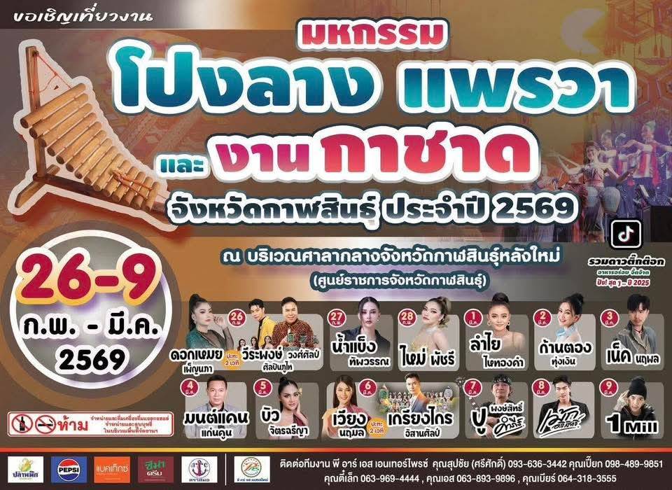 จึงขอเชิญชวนพี่น้องประชาชนทั้งในและนอกพื้นที่ ร่วมชมศิลปวัฒนธรรมโปงลางและผ้าแพรวา เลือกชม เลือกชิม เลือกซื้อสินค้าท้องถิ่น และร่วมกิจกรรมการกุศล ในงาน “มหกรรมโปงลาง แพรวา และงานกาชาด จังหวัดกาฬสินธุ์” ประจำปี 2569 ระหว่างวันที่ 26 กุมภาพันธ์ – 9 มีนาคม 2569 (12 วัน 12 คืน) ณ บริเวณศูนย์ราชการจังหวัดกาฬสินธุ์ อำเภอเมืองกาฬสินธุ์ จังหวัดกาฬสินธุ์