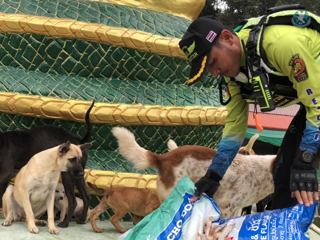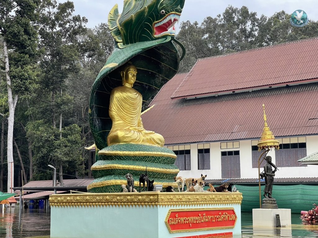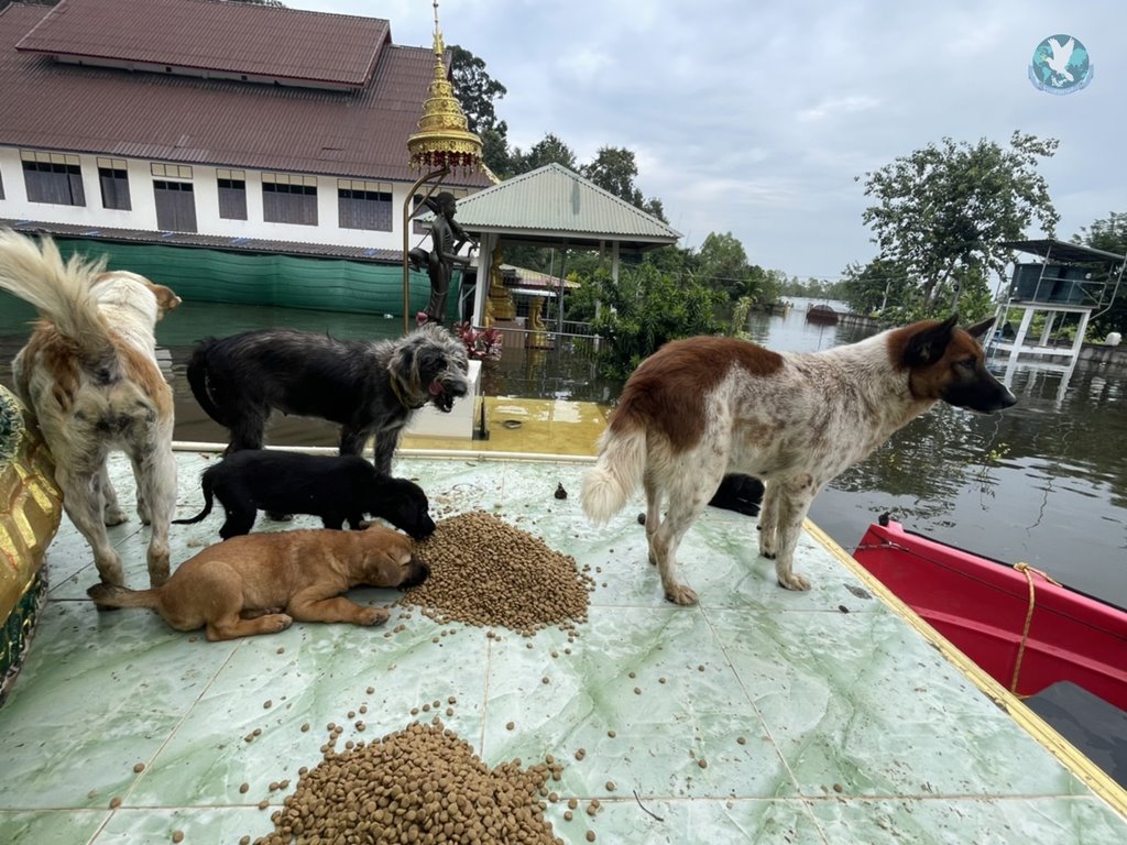 นายเก่งกาจ บ้งกาวงศ์ นายกสมาคมเมตตาธรรมทิพยสถาน “เต็กก่า” จีโหงวเกาะ พร้อมเจ้าหน้าที่หน่วยกู้ภัยเมตาธรรมกาฬสินธุ์ ได้นำข้าวกล่องน้ำดื่มลงเรือออกช่วยเหลือประชาชนที่ได้รับผลกระทบจากน้ำท่วมตลอดทั้งวัน ในพื้นที่ตำบลเจ้าท่า อำเภอกมลาไสย จังหวัดกาฬสินธุ์ ซึ่งระหว่างที่เจ้าหน้าที่ออกช่วยเหลือประชาชนก็พบว่าน้องหมาที่อาศัยอยู่บนลานพระพุทธรูป สมเด็จพระยุทธชยันตีมหาบารมีศรีฟ้าแดด วัดบ้านแจ้งจม ตำบลเจ้าท่า อำเภอกมลาไสย โดยน้องหมาหลายสิบชีวิตได้อาศัยอยู่บนลานพระพุทธรูปไปไหนไม่ได้ เจ้าหน้าที่จึงได้นำอาหารเม็ดและน้ำดื่มมาให้น้องหมาได้กิน พร้อมจะดูแลทุกๆชีวิตที่ประสบภัยในครั้งนี้