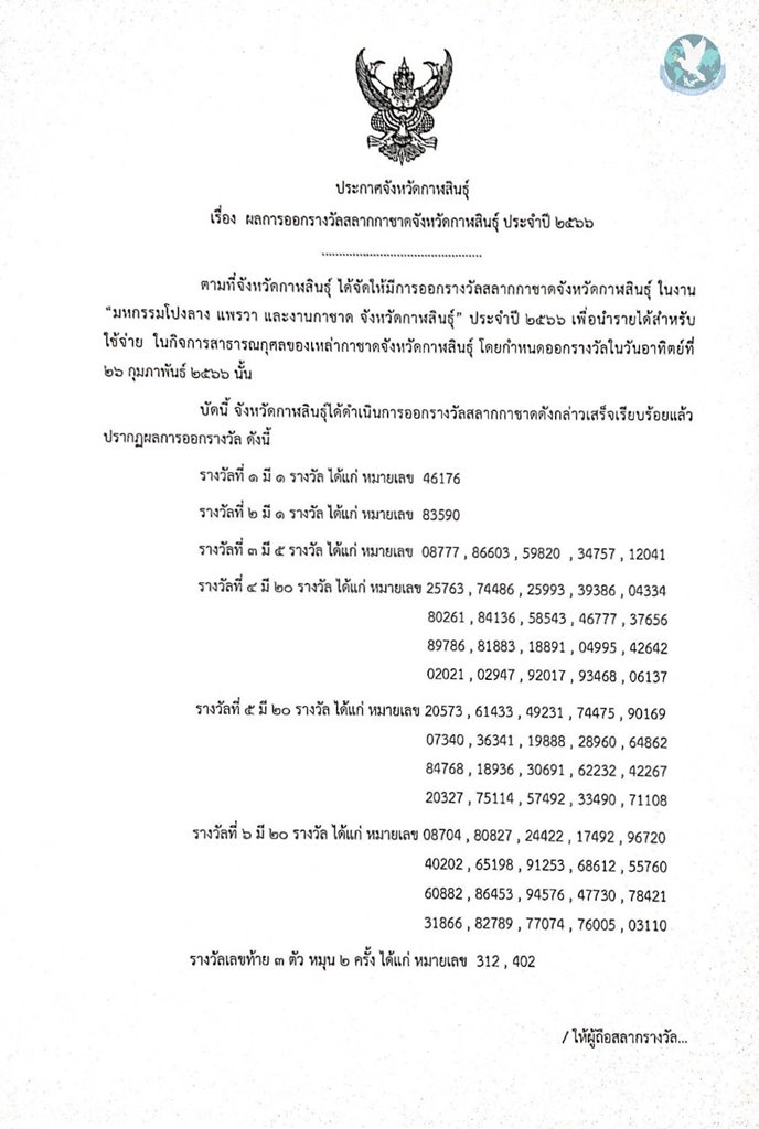 ประกาศผลการออกสลากกาชาดจังหวัดกาฬสินธุ์ งานมหกรรมโปงลาง แพรวา และงานกาชาดจังหวัดกาฬสินธุ์ ประจำปี 2566