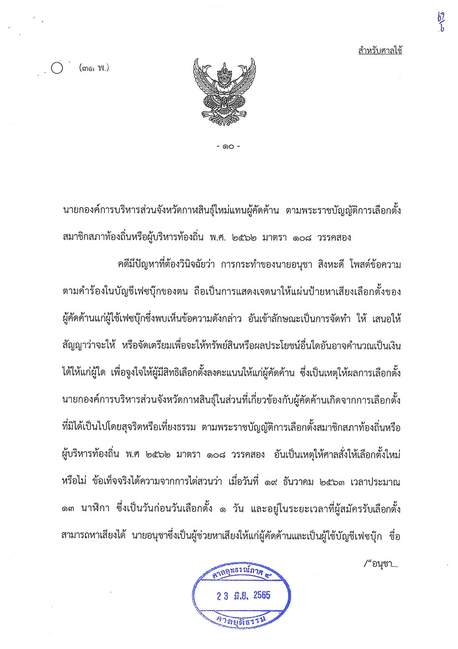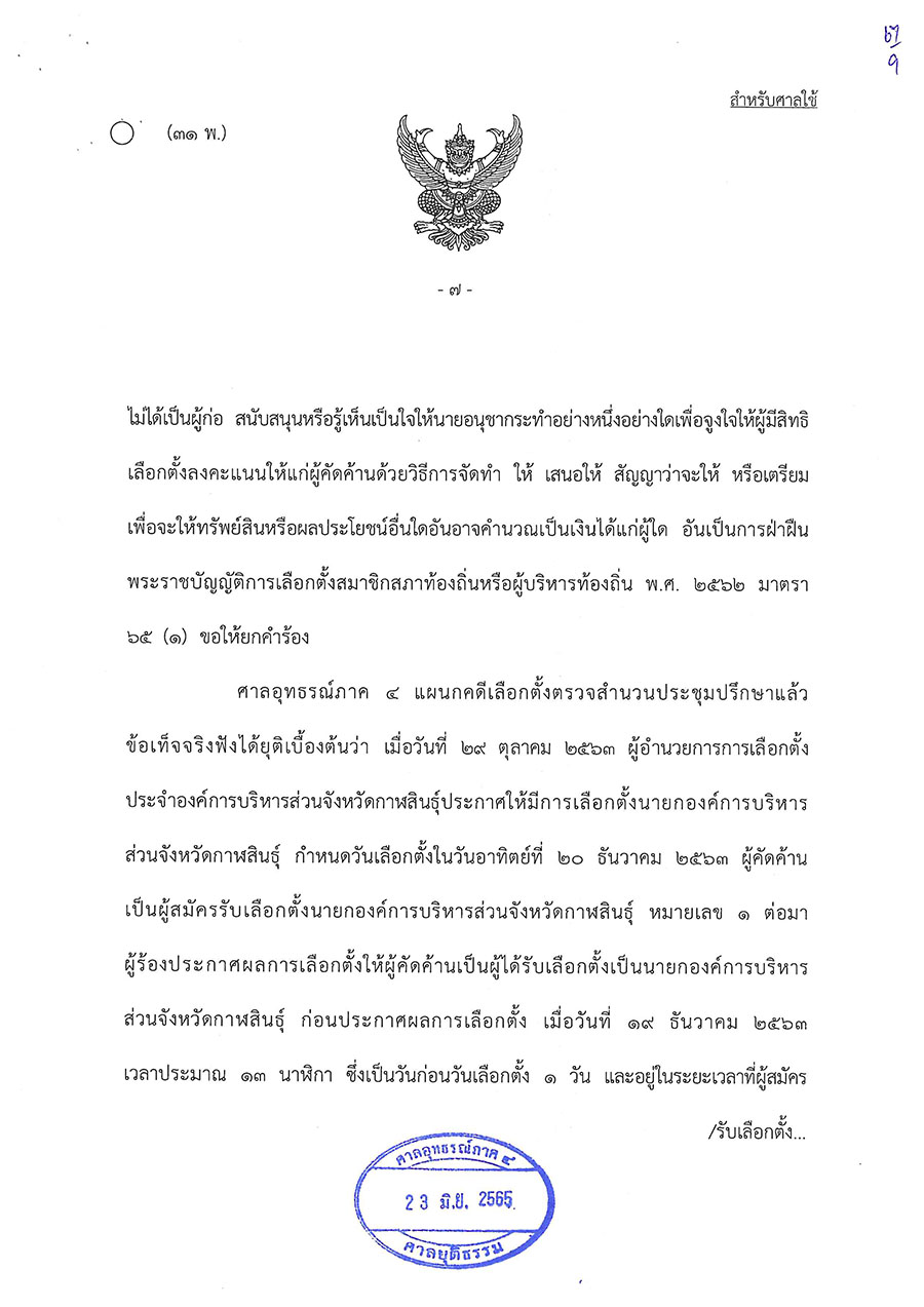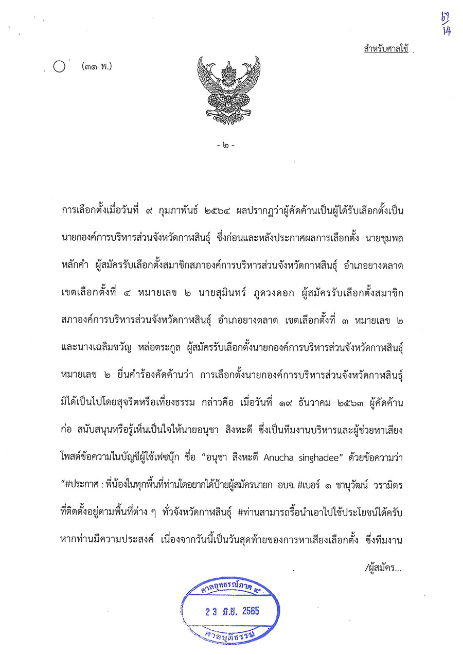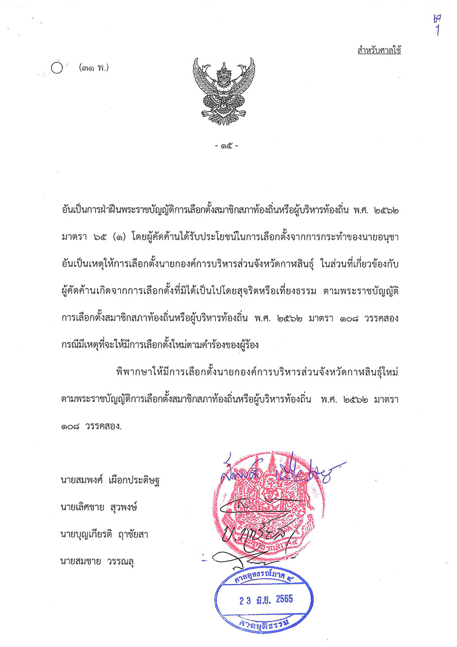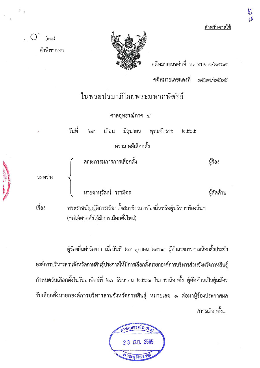วันนี้ (23 มิ.ย. 65) ศาลอุทธรณ์ภาค 4 พิพากษาให้มีการเลือกตั้งนายกองค์การบริหารส่วนจังหวัดกาฬสินธุ์ใหม่ ตามพระราชบัญญัติการเลือกตั้งสมาชิกสภาท้องถิ่นหรือผู้บริหารท้องถิ่น พ.ศ. 2562 มาตรา 108 วรรคสอง