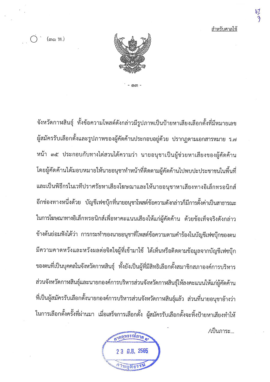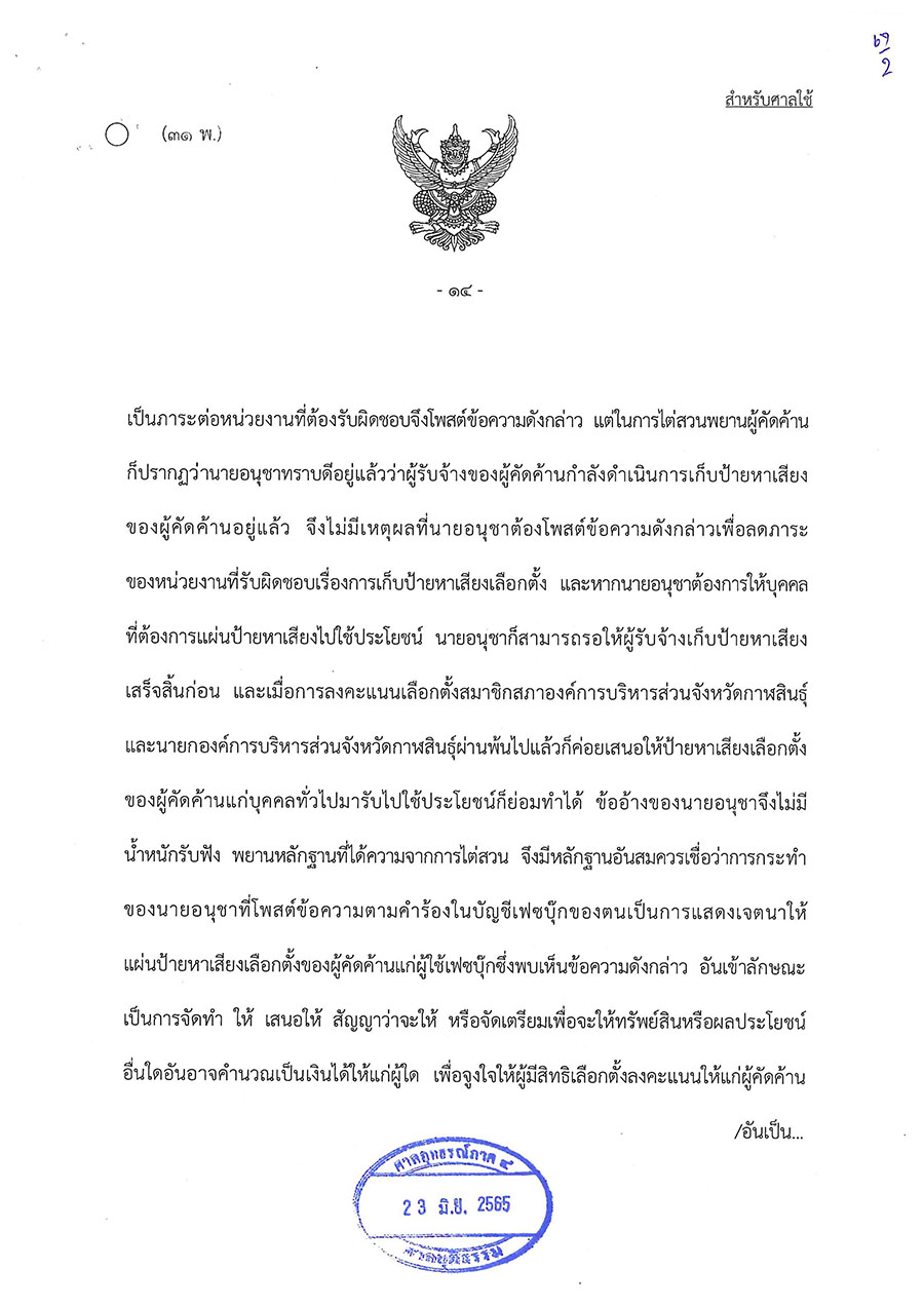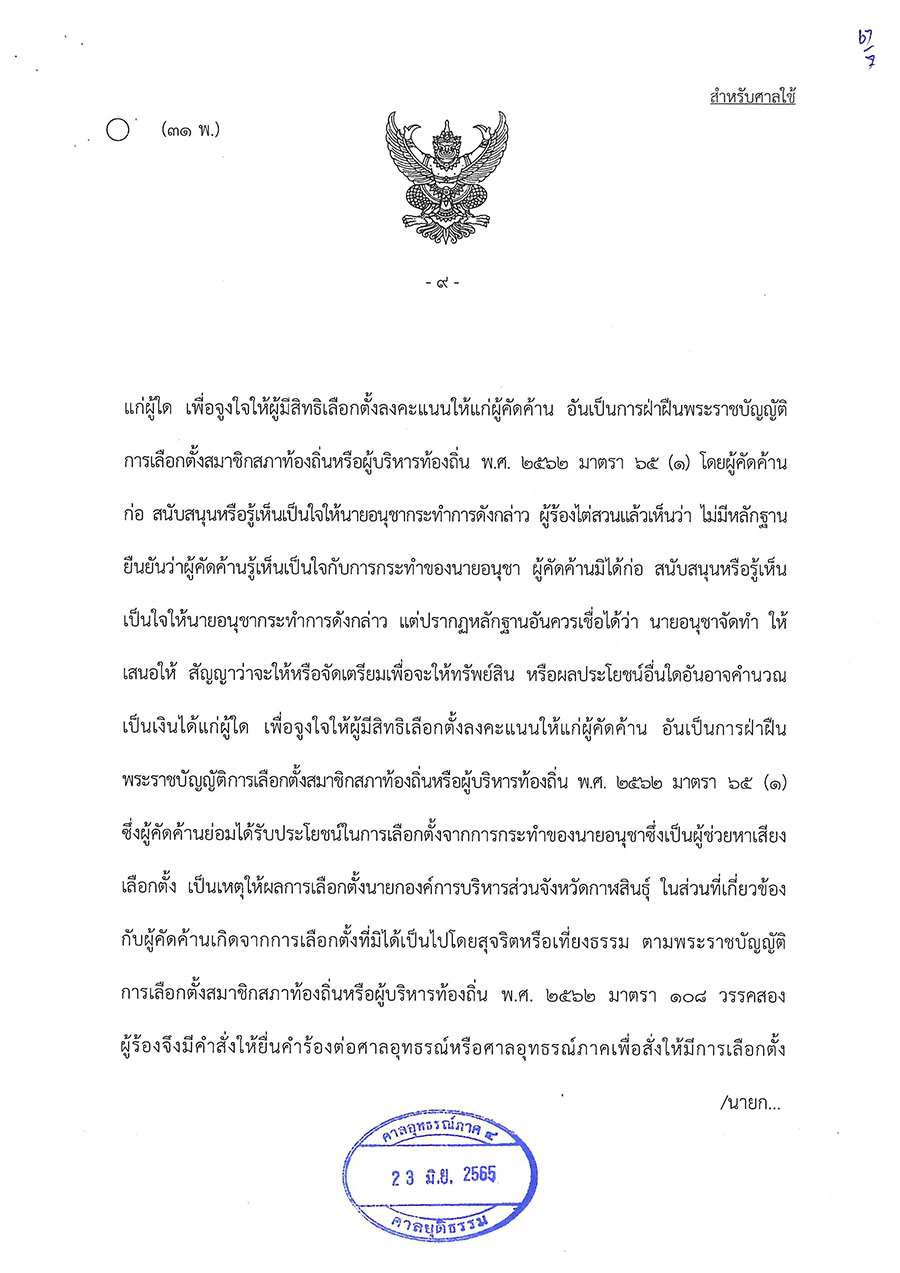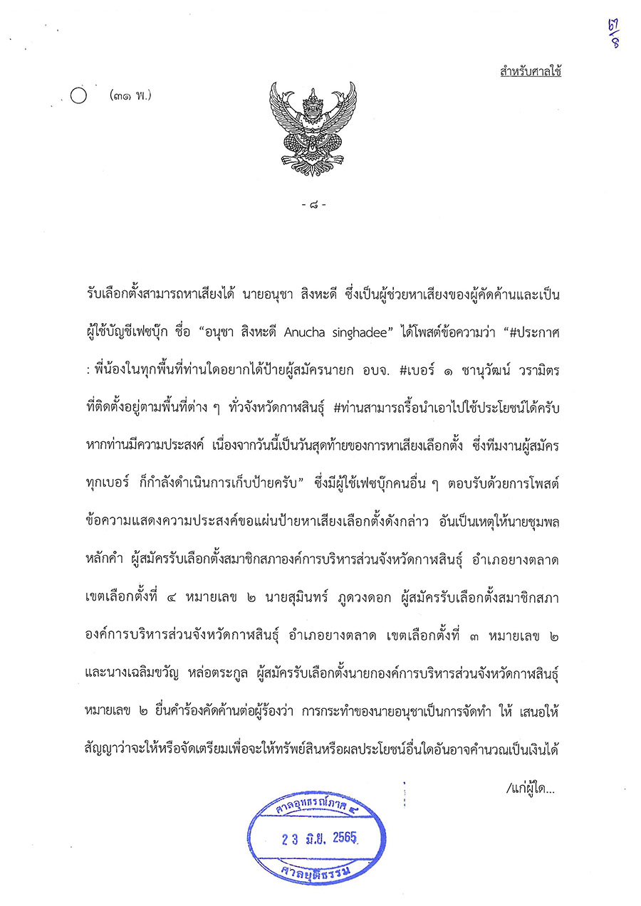 วันนี้ (23 มิ.ย. 65) ศาลอุทธรณ์ภาค 4 พิพากษาให้มีการเลือกตั้งนายกองค์การบริหารส่วนจังหวัดกาฬสินธุ์ใหม่ ตามพระราชบัญญัติการเลือกตั้งสมาชิกสภาท้องถิ่นหรือผู้บริหารท้องถิ่น พ.ศ. 2562 มาตรา 108 วรรคสอง