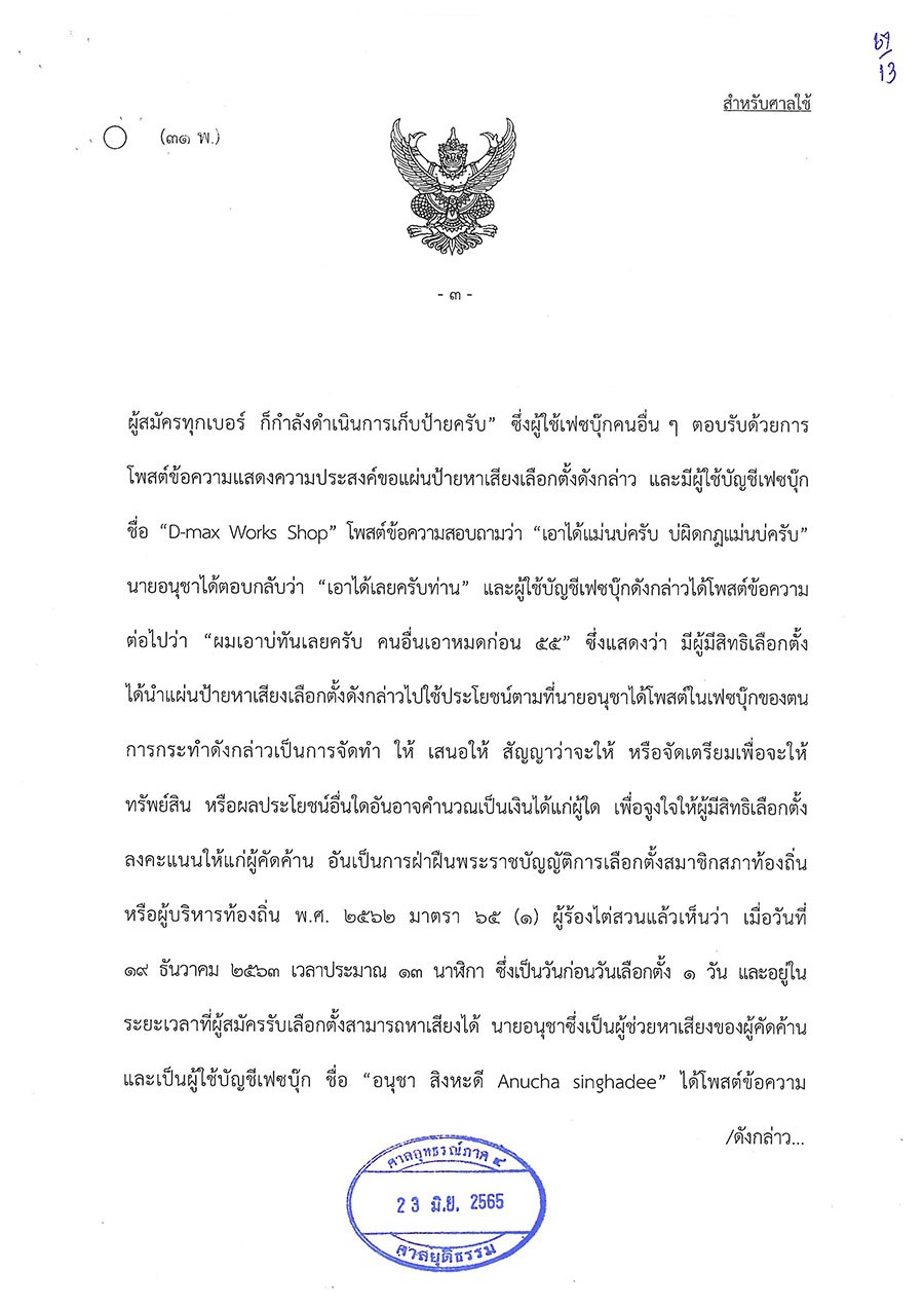ศาลอุทธรณ์ภาค 4 ได้เผยแพร่คำพิพากษา คดีเลือกตั้งหมายเลขดำที่ ลต. อบจ.1/2565 คดีหมายเลขแดงที่ 1528/2565 ระหว่างคณะกรรมการการเลือกตั้ง ผู้ร้อง กับนายชานุวัฒน์ วรามิตร ผู้คัดค้าน เรื่อง พระราชบัญญัติการเลือกตั้งสมาชิกสภาท้องถิ่นหรือผู้บริหารท้องถิ่นฯ (ขอให้ศาลสั่งให้มีการเลือกตั้งใหม่) โดยในส่วนของนายชานุวัฒน์ เป็นกรณีที่ กกต. เห็นว่าการที่นายอนุชา สิงหะดี ผู้ช่วยหาเสียงของนายชานุวัฒน์ โพสต์ข้อความผ่านโซเชียลมีเดีย ให้ผู้มีสิทธิเลือกตั้งสามารถเก็บป้ายหาเสียงของนายชานุวัฒน์ไปใช้ประโยชน์ได้ฟรี ซึ่งเข้าข่ายเป็นการ จัดทำให้ เสนอให้ สัญญาว่าจะให้ทรัพย์สินหรือประโยชน์อื่นใดอันอาจคำนวณเป็นเงินได้ เพื่อจูงใจให้ผู้มีสิทธิเลือกตั้งลงคะแนนให้กับนายชานุวัฒน์ เป็นเหตุให้การเลือกตั้งไม่สุจริตเที่ยงธรรมตามมาตรา 108 วรรคสอง พ.ร.บ.การเลือกตั้งสมาชิกสภาท้องถิ่นหรือผู้บริหารท้องถิ่น 2562