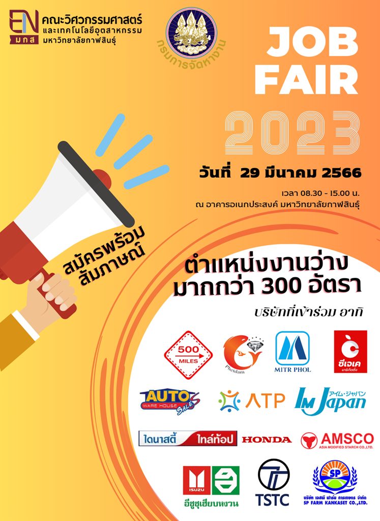 ดร.สถิตพงศ์ เสงี่ยมศักดิ์ รองคณบดีงานบริการศึกษาและวิจัย คณะวิศวกรรมศาสตร์และเทคโนโลยีอุตสาหกรรม มหาวิทยาลัยกาฬสินธุ์ กล่าวเชิญชวนว่า “มหาวิทยาลัยกาฬสินธุ์ มีข่าวดีสำหรับประชาชนทุกท่าน ที่ยังหางานและว่างงานอยู่ เราจะมีโครงการ JOB FAIR ปี 2566 ซึ่งจะจัดขึ้นในวันที่ 29 มี.ค. 2566 นี้ ที่มหาวิทยาลัยกาฬสินธุ์ พื้นที่ในเมือง ถ้าหากว่าทุกท่านยังว่างงานอยู่หรือสนใจที่จะเปลี่ยนงานก็สามารถมาร่วมโครงการกับทางมหาวิทยาลัยกาฬสินธุ์ได้ ซึ่งทางมหาวิทยาลัยฯ ได้ร่วมมือกับจัดหางานจังหวัดกาฬสินธุ์ จะมีตำแหน่งงานต่าง ๆ กว่า 300 อัตรา มาให้ทุกท่านได้ช้อปตามความสนใจ และยังมีการให้คำปรึกษาในเรื่องของการทำงานในต่างประเทศ ก็สามารถมาขอรับคำปรึกษากับทางจัดหางานจังหวัดได้เช่นกัน”
