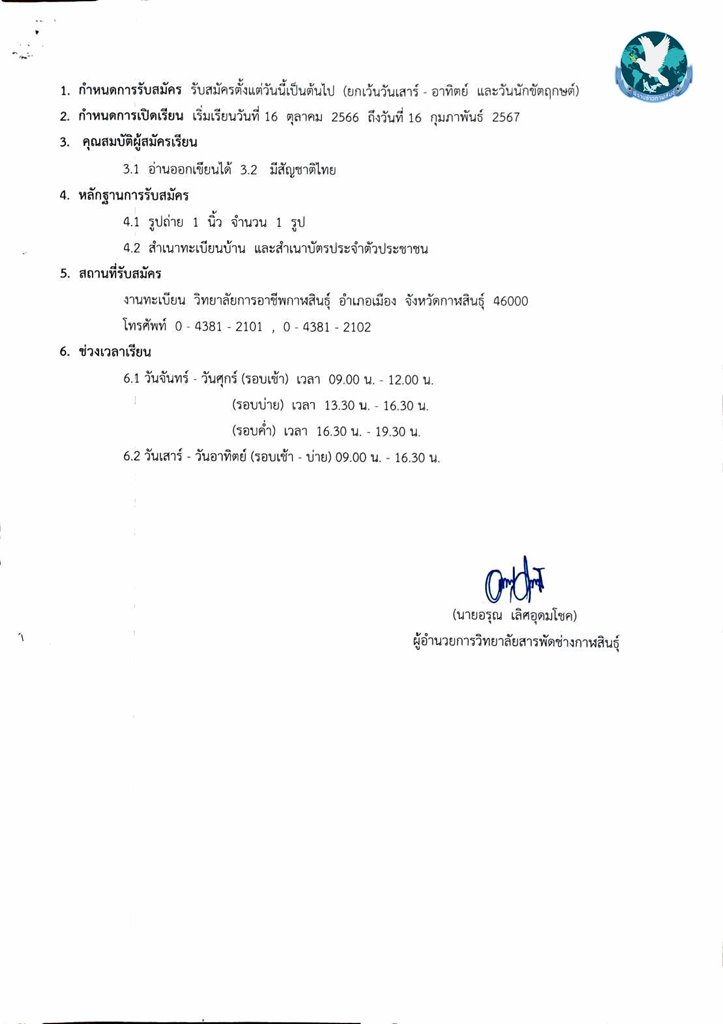วิทยาลัยการอาชีพกาฬสินธุ์ ประกาศรับสมัครนักศึกษาวิชาชีพเฉพาะทาง (ระยะสั้น) ทั้งในเวลาราชการ และนอกเวลาราชการ ประจำภาคเรียนที่ 2 ปีการศึกษา 2566 ระหว่างวันที่ 16 ต.ค. 2566 – 16 ก.พ. 2567 โดยสามารถสอบถามข้อมูลเพิ่มเติมได้ที่ 043 812101 , 043 812102 หรือดาวน์โหลดรายละเอียดได้ที่เว็บไซต์ www.ksicec.ac.th