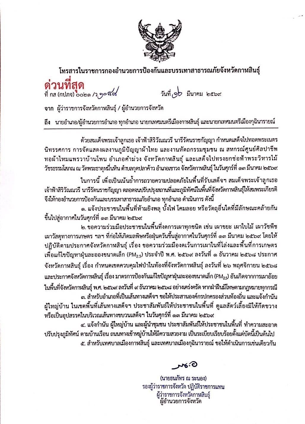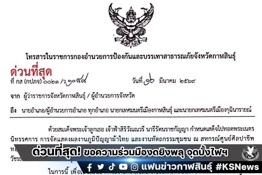ด่วนที่สุด! ขอความร่วมมือประชาชนในพื้นที่จังหวัดกาฬสินธุ์ งดยิงพลุ บั้งไฟ โคมลอย หรือวัสดุอื่นใดที่มีลักษณะคล้ายกันขึ้นไปสู่อากาศ และงดการเผาทุกชนิด ที่ก่อให้เกิดมลพิษหรือฝุ่นควันขึ้นสู่อากาศ ในวันศุกร์ที่ 13 มีนาคม 2569 เพื่อเป็นการการถวายความปลอดภัยในพื้นที่รับเสด็จฯ สมเด็จพระเจ้าลูกเธอ เจ้าฟ้าสิริวัณณวรี นารีรัตนราชกัญญา
