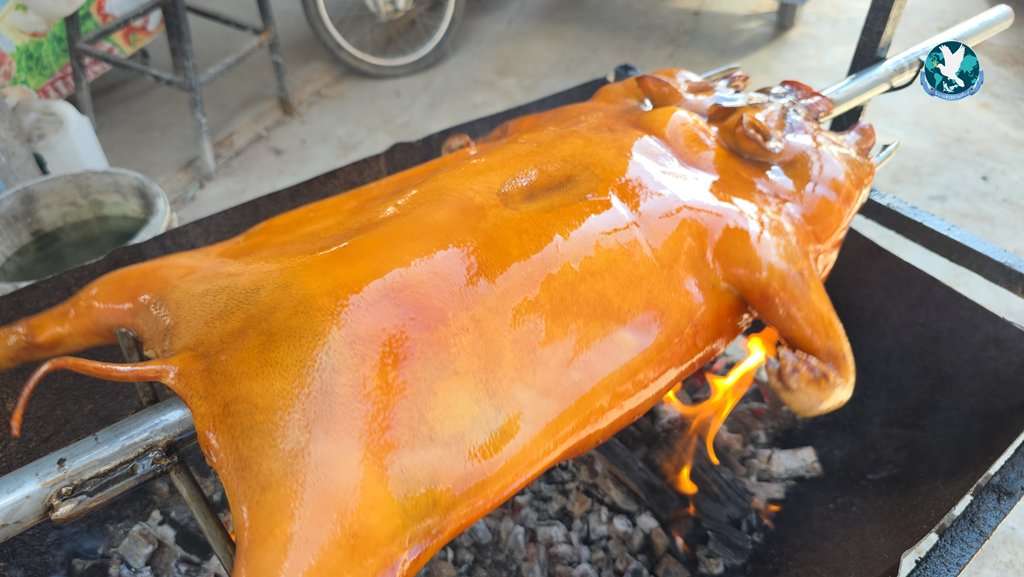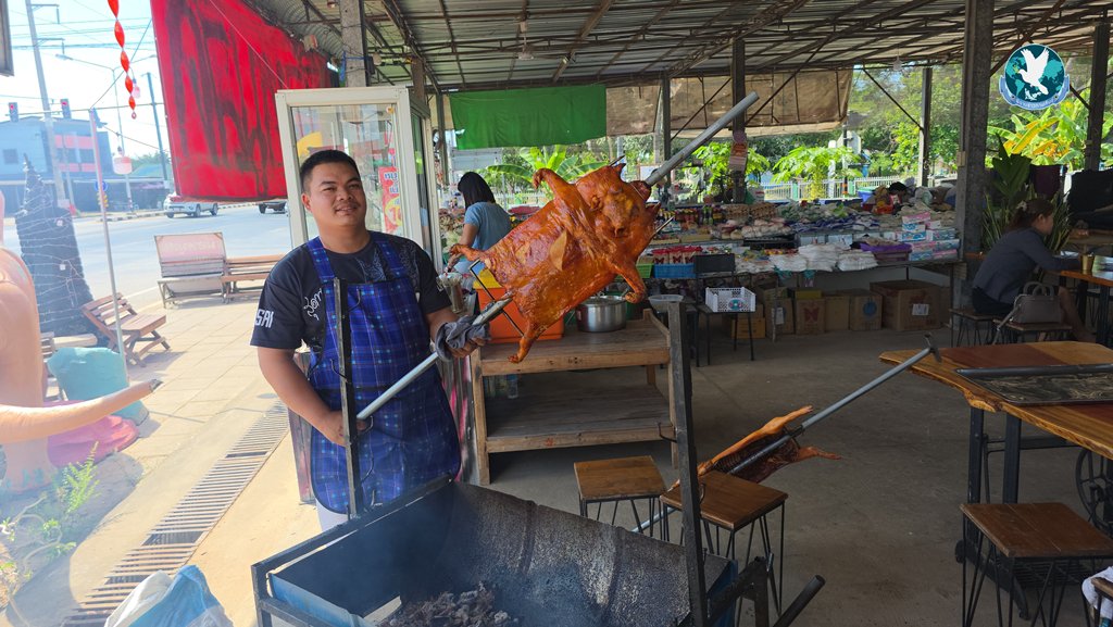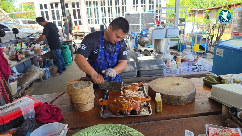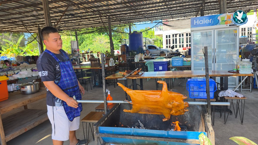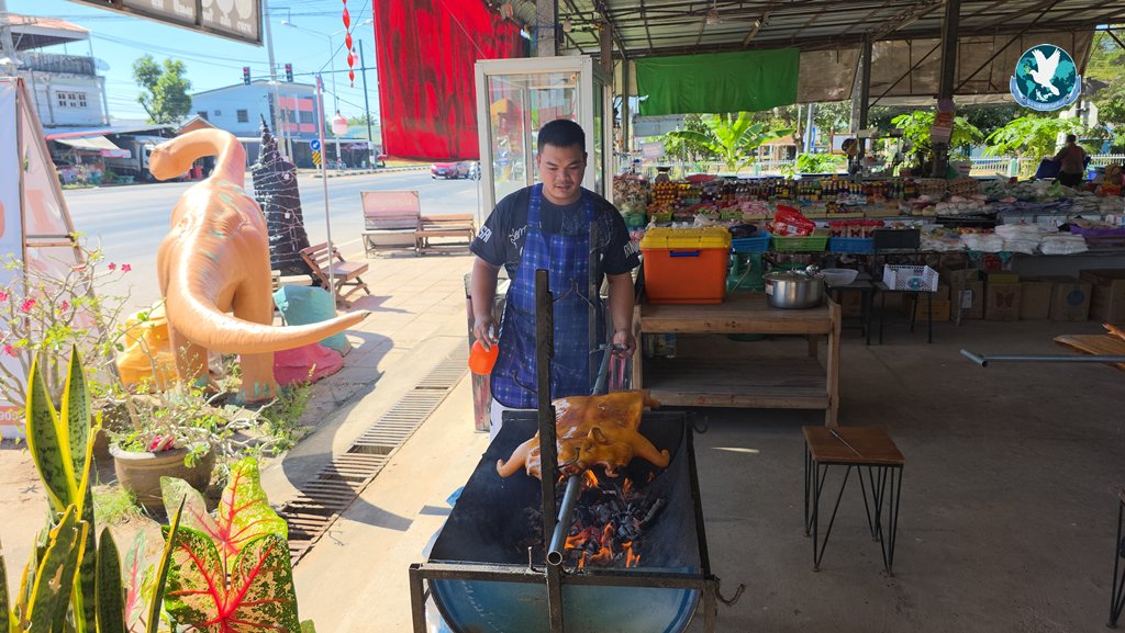 คุณนุ นุฐพล วรรณภักดิ์ เจ้าของฟาร์มหมู หมูป่าท่งนาฟาร์ม วัย 32 ปี บอกว่า หมูทุกตัวตนเองเลี้ยงเองมากับมือ ปีนี้เป็นปีที่ 2 ที่หันหมูขาย หมูที่หัวก็จะมีทั้งหมูป่า/หมูดำ ตัวที่กำลังหันอยู่นี้น้ำหนักก่อนชำแหละจะอยู่ที่ 7-8 กิโลกรัม ราคาพร้อมรับประทานจะอยู่ที่ 1,500 บาท เทคนิคในการหันก็จะเน้นส่วนหนังให้กรอบนอกนุ่มใน โดยตนเองจะหันให้หมูกรอบก่อนส่งลูกค้าที่ประมาณ 40 นาที รสชาติจะต่างจากหมูแช่แข็งเพราะจะมีความสด เพราะหมูของเราเชือดใหม่เริ่มชำแหละตามออเดอร์ของลูกค้า เน้นความสดสะอาด อีกเทคนิคคือการฉีดน้ำมันพืชเพื่อให้ผิวของหมูมีความมันตลอด ถ้าผิวเขาแห้งย่างไม่ทันผิวก็จะดำจะไหม้ได้