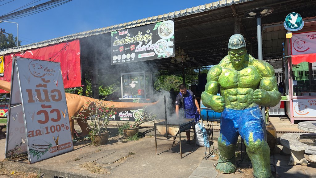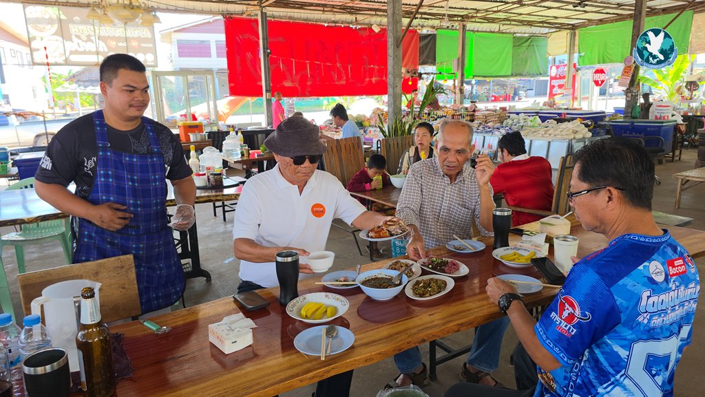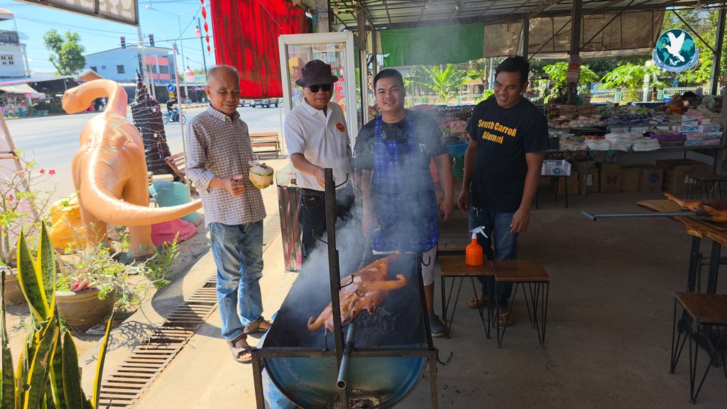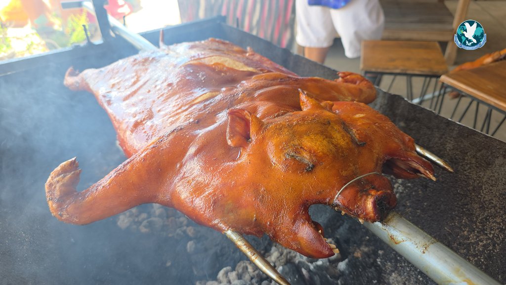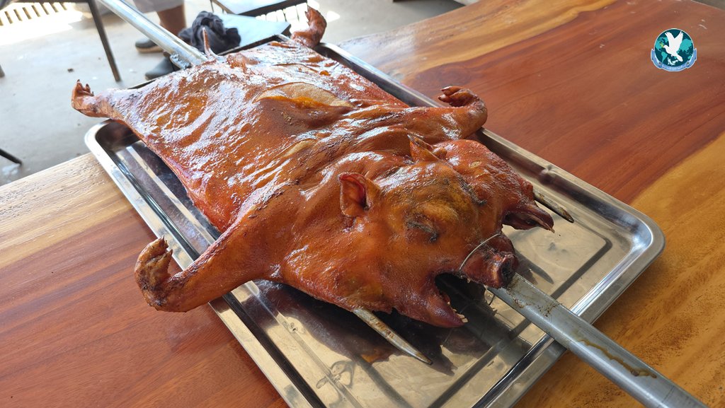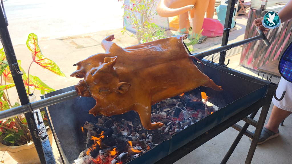 คุณนุ นุฐพล วรรณภักดิ์ เจ้าของฟาร์มหมู หมูป่าท่งนาฟาร์ม วัย 32 ปี บอกว่า หมูทุกตัวตนเองเลี้ยงเองมากับมือ ปีนี้เป็นปีที่ 2 ที่หันหมูขาย หมูที่หัวก็จะมีทั้งหมูป่า/หมูดำ ตัวที่กำลังหันอยู่นี้น้ำหนักก่อนชำแหละจะอยู่ที่ 7-8 กิโลกรัม ราคาพร้อมรับประทานจะอยู่ที่ 1,500 บาท เทคนิคในการหันก็จะเน้นส่วนหนังให้กรอบนอกนุ่มใน โดยตนเองจะหันให้หมูกรอบก่อนส่งลูกค้าที่ประมาณ 40 นาที รสชาติจะต่างจากหมูแช่แข็งเพราะจะมีความสด เพราะหมูของเราเชือดใหม่เริ่มชำแหละตามออเดอร์ของลูกค้า เน้นความสดสะอาด อีกเทคนิคคือการฉีดน้ำมันพืชเพื่อให้ผิวของหมูมีความมันตลอด ถ้าผิวเขาแห้งย่างไม่ทันผิวก็จะดำจะไหม้ได้