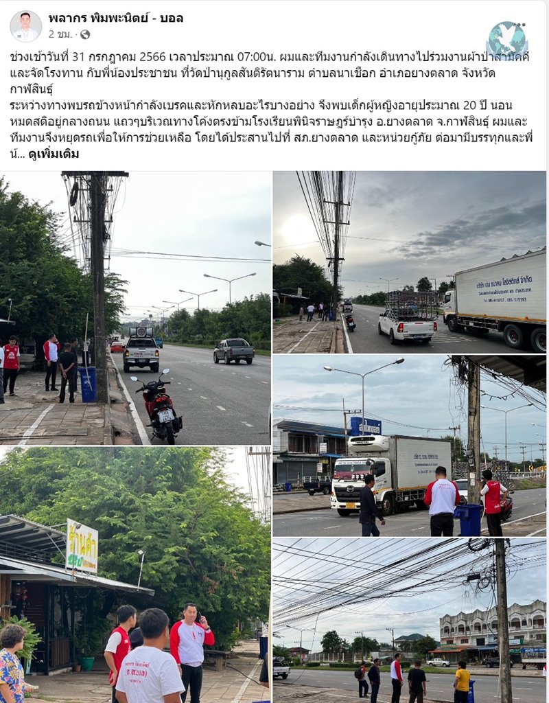 วันนี้ (31 ก.ค. 2566) เวลา 12.26 น. ที่เพจ พลากร พิมพะนิตย์ – บอล ที่มีผู้ติดตาม 7.6 พัน คน ได้โพสต์รูปภาพพร้อมข้อความแบบสาธารณะว่า “ช่วงเช้าวันที่ 31 กรกฎาคม 2566 เวลาประมาณ 07:00 น. ผมและทีมงานกำลังเดินทางไปร่วมงานผ้าป่าสามัคคีและจัดโรงทาน กับพี่น้องประชาชน ที่วัดป่านุกูลสันติรัตนาราม ตำบลนาเชือก อำเภอยางตลาด จังหวัดกาฬสินธุ์ ระหว่างทางพบรถข้างหน้ากำลังเบรคและหักหลบอะไรบางอย่าง จึงพบเด็กผู้หญิงอายุประมาณ 20 ปี นอนหมดสติอยู่กลางถนน แถวๆบริเวณทางโค้งตรงข้ามโรงเรียนพินิจราษฎร์บำรุง อ.ยางตลาด จ.กาฬสินธุ์ ผมและทีมงานจึงหยุดรถเพื่อให้การช่วยเหลือ โดยได้ประสานไปที่ สภ.ยางตลาด และหน่วยกู้ภัย ต่อมามีบรรทุกและพี่น้องประชาชนช่วยกันเอารถจอดกั้นไว้ เพื่อป้องกันอุบัติเหตุ ระหว่างที่รอเจ้าหน้าที่ตำรวจเข้าช่วยเหลือ ต้องขอชื่นชมพี่คนขับรถบรรทุก ที่ช่วยจอดขวางเด็กไว้ ทั้ง ๆ ที่ได้รับโทรศัพท์หลายสายจากลูกค้าและเจ้านาย ที่เร่งให้ไปส่งของ แต่ก็อยู่ต่อเพื่อป้องกันชีวิตของเด็กไว้ ณ ที่นี้ด้วยครับ และขอบคุณเจ้าหน้าที่ตำรวจ สภ.ยางตลาดและหน่วยกู้ภัย ที่มาช่วยเหลืออย่างรวดเร็วครับ