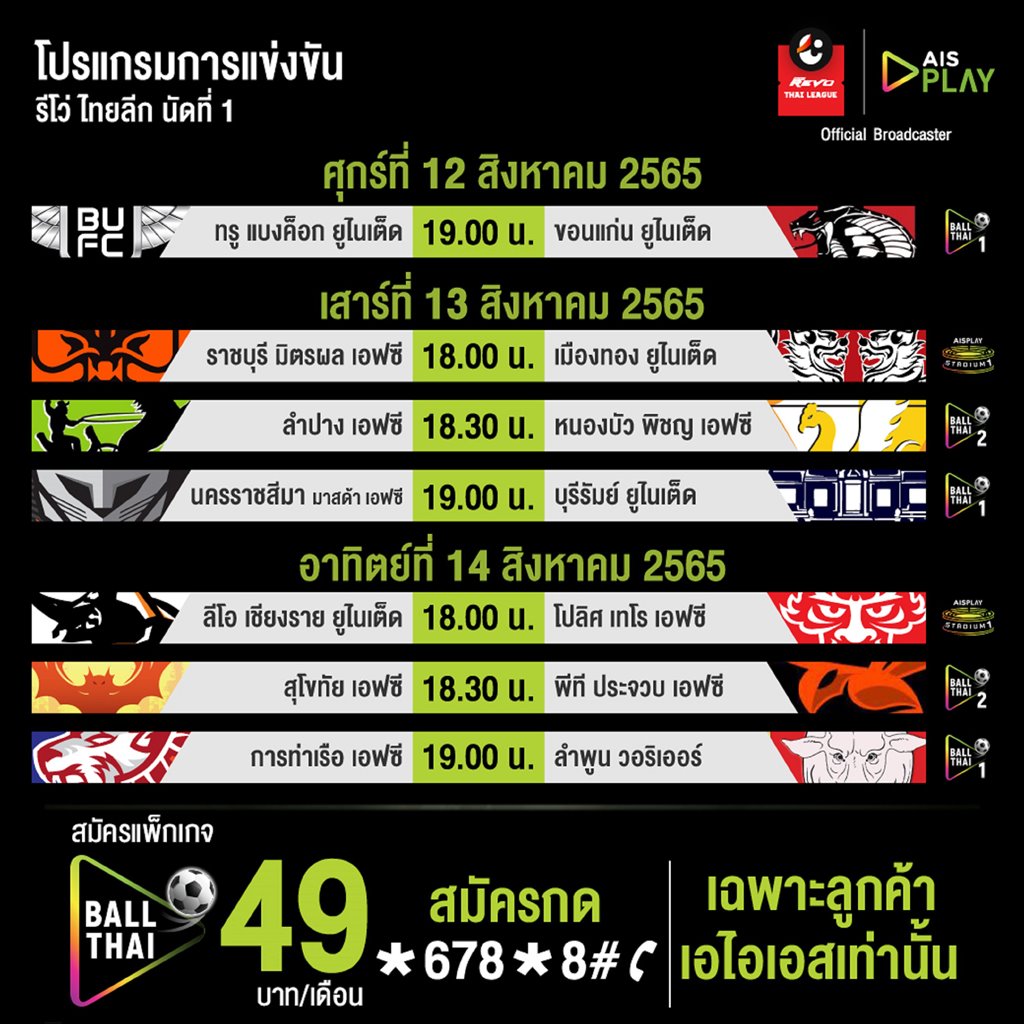 มาร่วมชมและเชียร์นักเตะที่ชื่นชอบรวมทั้งสโมสรที่รักในศึกฟุตบอลรีโว่ ไทยลีก ฤดูกาล 2022-2023 นี้ไปพร้อมกัน โดยนัดเปิดสนาม แบงค้อก ยูไนเต็ด จะเปิดบ้านต้อนรับการมาเยือนของขอนแก่น ยูไนเต็ด โดยเริ่มคิกออฟในเวลา 19.00 น. สำหรับคู่บิ๊กประจำสัปดาห์ นครราชสีมา เจอศึกหนักเมื่อต้องเปิดบ้านต้อนรับแชมป์เก่าอย่างบุรีรัมย์ ยูไนเต็ด โดยสามารถติดตาม ฟุตบอลรีโว่ ไทยลีก และ ฟุตบอล M-150 แชมเปี้ยนชิพ ในฤดูกาลใหม่นี้ผ่านทาง AIS PLAY ในทุกช่องทาง ทั้งแอปพลิเคชัน AIS PLAY, เว็บไซต์ ais.th/play/football , กล่อง AIS PLAYBOX, SAMSUNG Smart TV, Apple TV รวมทั้งสามารถเช็คตารางการถ่ายทอดสดการแข่งขันได้ที่ https://www.ais.th/play/football/matches/thaileague เพราะบอลไทย AIS PLAY เราคือที่ 1