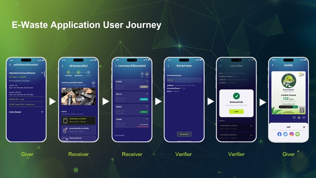 โดยเทคโนโลยี Blockchain จะช่วยทำให้ผู้ทิ้งมั่นใจว่าขยะ E-Waste จะถูกนำส่งไปยังกระบวนการรีไซเคิลที่ได้มาตรฐานและโปร่งใส ซึ่งจะสามารถตรวจสอบสถานะของกระบวนการนำส่งได้ในแต่ละขั้นตอน และนอกเหนือจากนั้นยังสามารถคำนวณปริมาณ Carbon Scores ซึ่งเป็นเครื่องบ่งบอกถึงการลงมือทำในกิจกรรมที่ช่วยลดการปล่อยก๊าซเรือนกระจก ที่สามารถแชร์ในโซเชียลและแสดงตัวตนในโลก Metaverse ได้ โดย AIS ยังมีแผนพัฒนาให้ Carbon Scores ที่เกิดจากการมีส่วนร่วมของทุกภาคส่วนในการจัดการขยะ E-Waste อย่างถูกต้อง นำไปใช้เป็น Utility Token ที่จะช่วยต่อยอดธุรกิจให้กับองค์กรพันธมิตรที่เข้าร่วมโครงการนี้อีกด้วย”