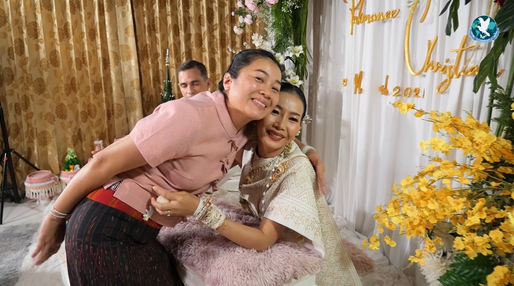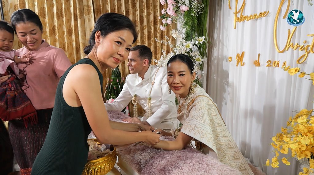 หลังจากนั้นก็เป็นพิธีสู่ขวัญเจ้าบ่าวเจ้าสาว ที่ญาติพี่น้องฝ่ายเจ้าสาวต่างมาผูกแขนรับเจ้าบ่าวจำนวนมาก โดยเฉพาะคุณแม่เจ้าสาวที่ใส่เงินผูกขวัญรับลูกเขยชาวต่างชาติเป็นเงินถึง 1 หมื่นบาท ส่วนน้องสาวของเจ้าสาวนั้นก็ผูกแขนรับขวัญพี่สาวของตัวเองเป็นสร้อยข้อมือทองคำ 1 เส้นเช่นกัน