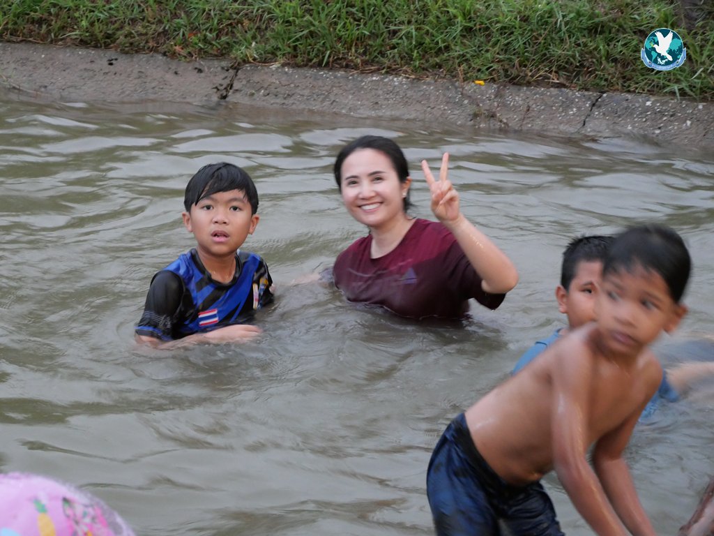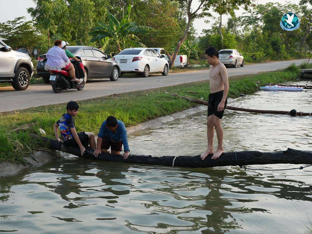 ปิดท้ายด้วยอีกหนึ่งสีสันของวันนี้ ที่มีผู้ใหญ่ใจดีที่มอบรางวัลให้เด็กที่กำลังเล่นน้ำคลองได้โชว์ทักษะการเดินทรงตัวผ่านสะพานข้ามน้ำคลอง ที่เป็นท่อนไม้ที่วางพาดไว้ ว่าใครเดินผ่านได้ไม่ตกน้ำ ก็จะได้รับค่าขนมไปคนละ 20 บาท เป็นรางวัล