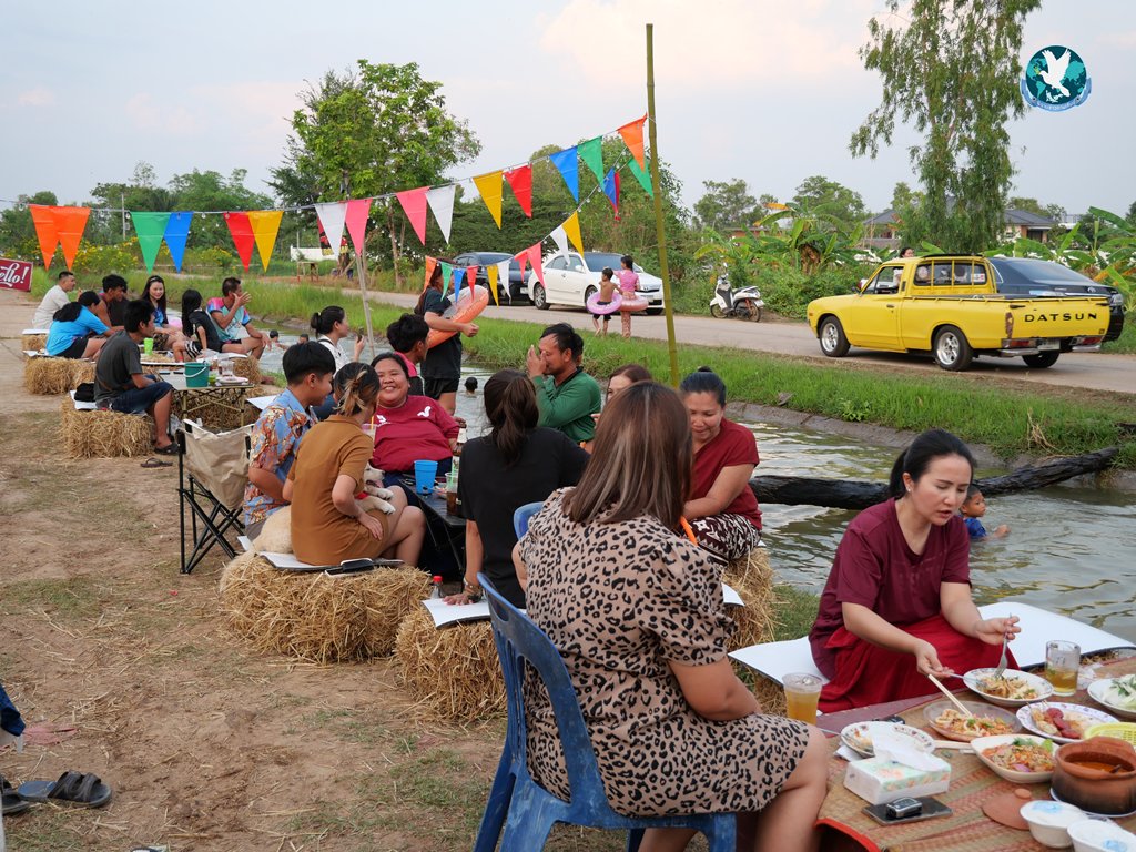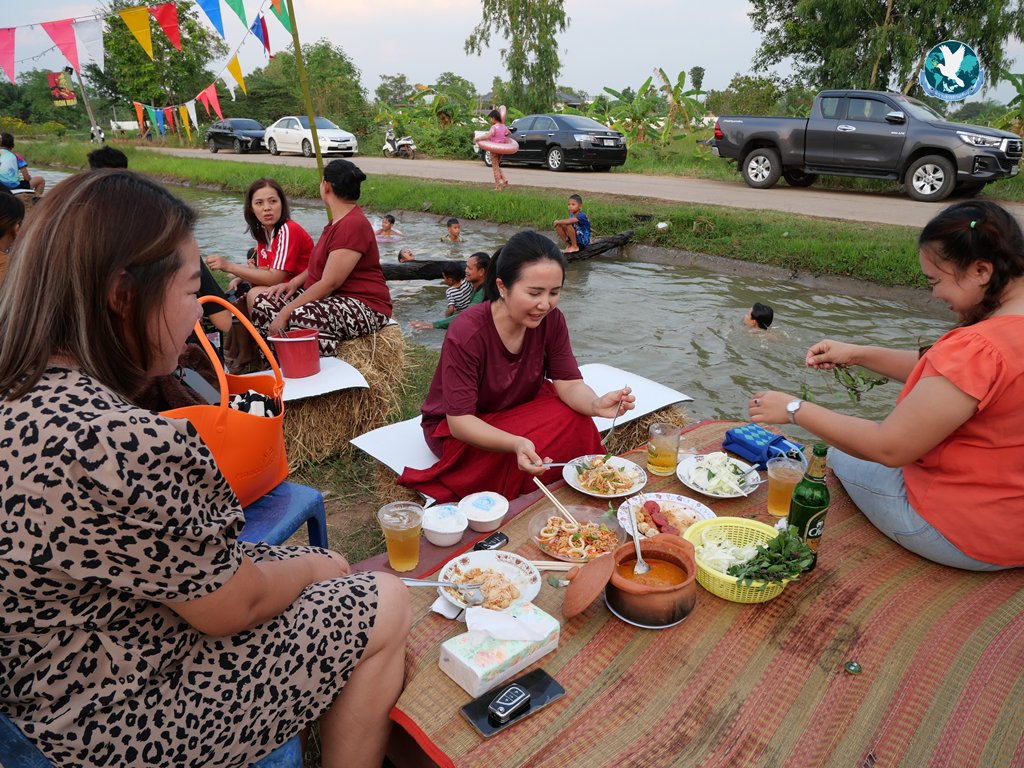 สีสันของเด็กๆ กลุ่มนี้ ที่กำลังเล่นน้ำคลองอยู่ ก็ได้โชว์ทักษะการตีลังกาให้ดู-ดำน้ำแข่งกัน ซึ่งได้รับการฝึกฝนมาอย่างดีแล้ว โดยมีผู้ปกคลองอยู่ดูแลอย่างใกล้ชิด ส่วนผู้ปกครองก็ใช้โอกาสนี้ได้นั่งพูดคุยสอบถามสารทุกข์สุขดิบกันไปด้วย และรับประทานเมนูยอดฮิตของคนอีสานคือ “ข้าวปุ้น” เป็นขนมจีนน้ำยากะทิอย่างเอร็ดอร่อย กับบรรยากาศของร้านค้าที่เปิดริมคลองให้เด็กและผู้ปกครองได้ใช้เวลาช่วงวันหยุดพักผ่อนอย่างมีความสุข คลายร้อนจากสภาพอากาศที่ร้อนจัดในช่วงนี้ไปในตัวด้วย